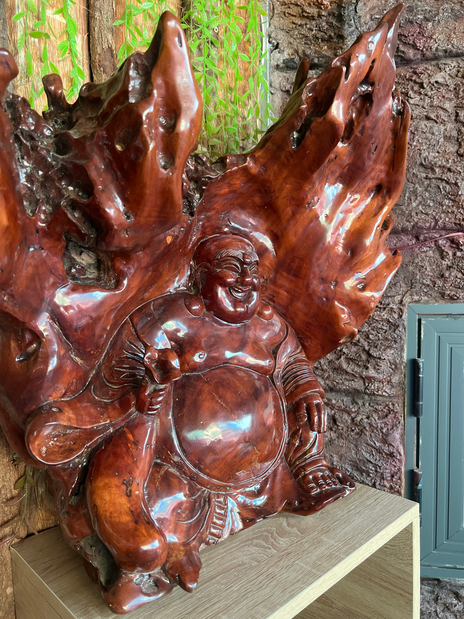 A highly polished, dark reddish-brown wooden carving dominates the frame. The carving appears to be in the form of a reclining figure, with suggestions of a face, round belly, and limbs. The wood has…read more