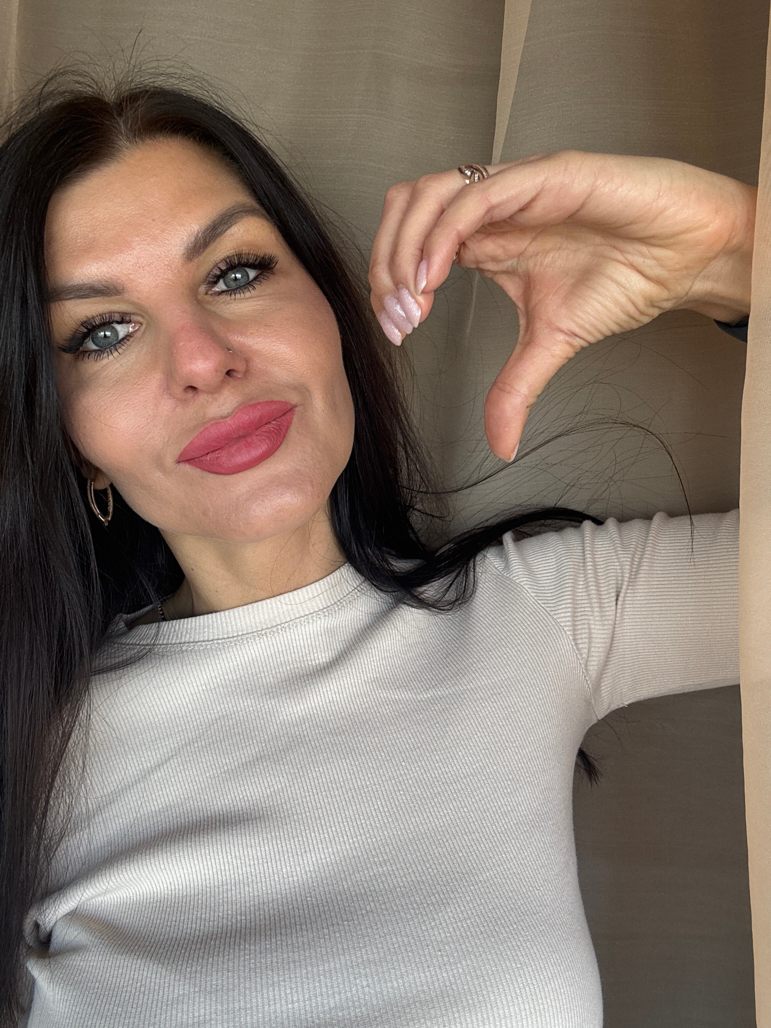 The image is an indoor selfie taken from a rotated perspective. A woman with fair skin and dark hair is facing the camera. Her eyes are light-colored with dark mascara. She has defined eyebrows and a…read more