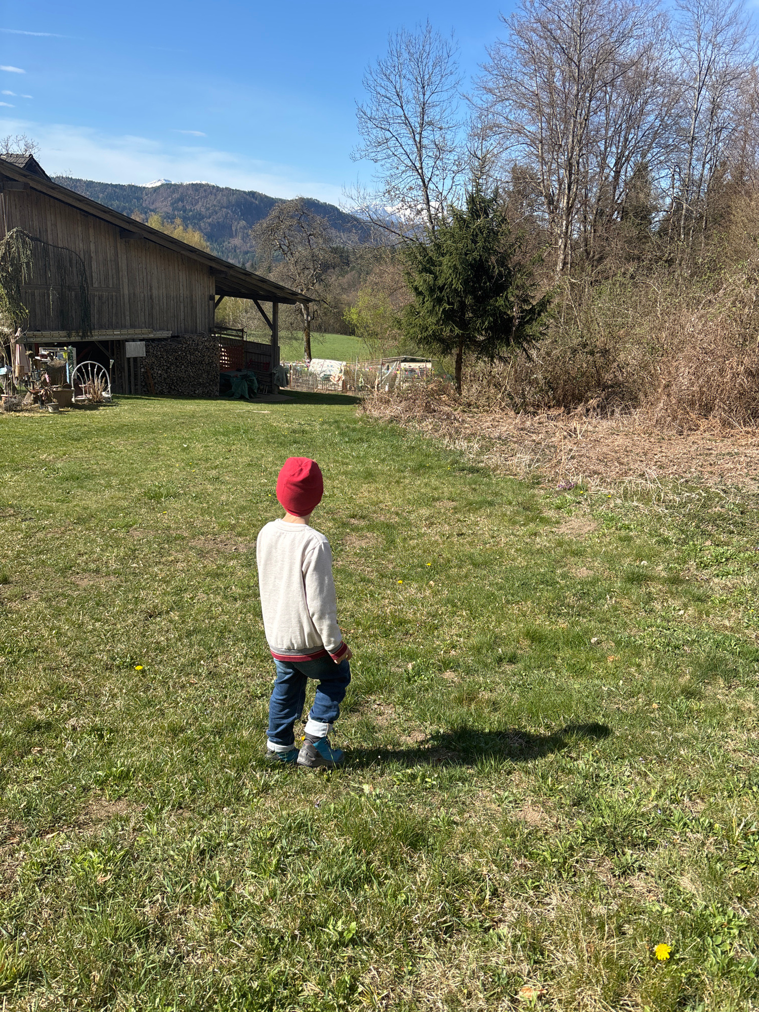 A young child wearing a red hat, light gray sweater, and blue jeans is kneeling on a grassy lawn. The lawn is partly dried and brown, with a few scattered yellow dandelions. To the left of the child,…read more