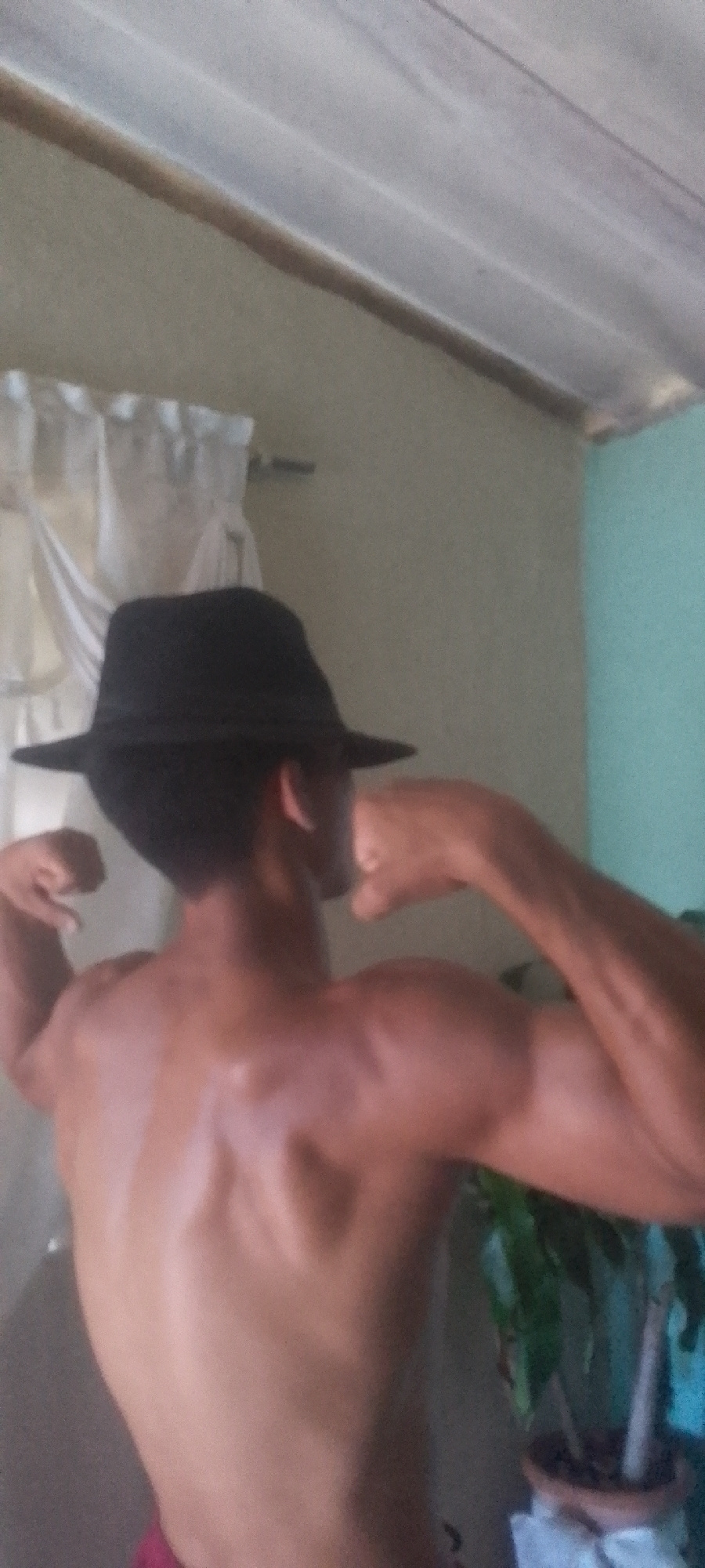 A shirtless, muscular man wearing a black fedora hat is flexing his biceps and back muscles. He is standing indoors, possibly in a home. In the background are white curtains, a wall painted in light c…read more