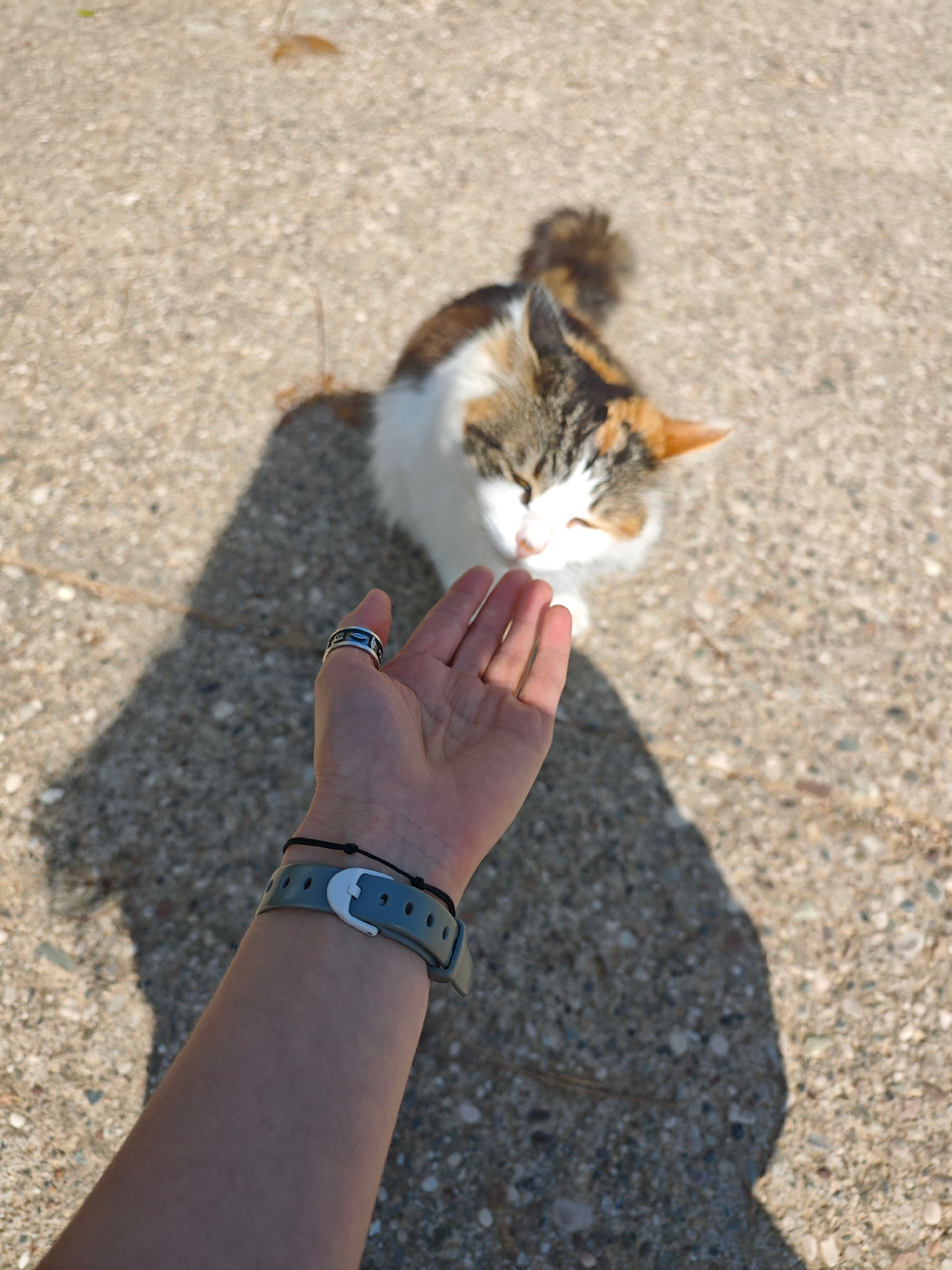 A partially visible person is extending their right hand towards a calico cat on a concrete surface. The person's hand is adorned with a ring on the ring finger and two bracelets on the wrist. The cat…read more
