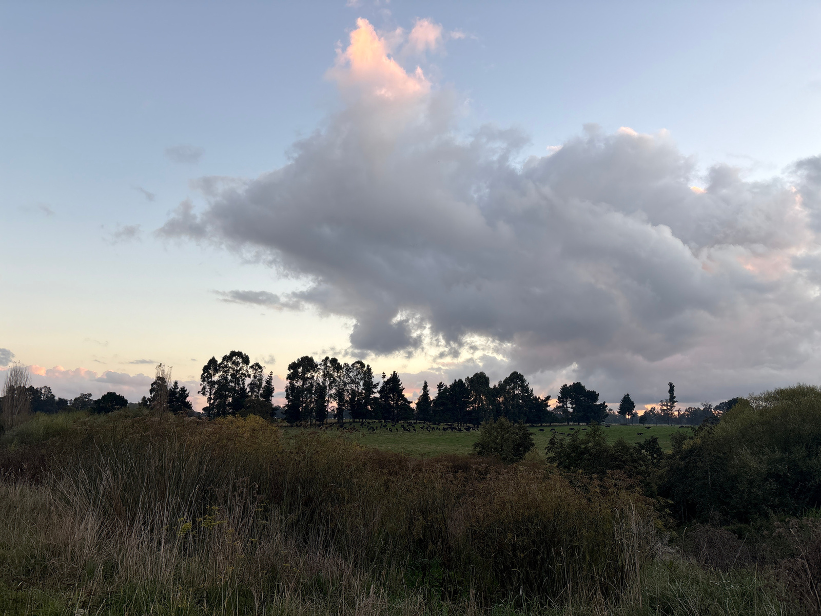 The photograph depicts a rural landscape in Purranque, Chile, under a cloudy sky at dusk. A large, illuminated cloud formation dominates the upper portion of the image. Below, a field is visible, dott…read more