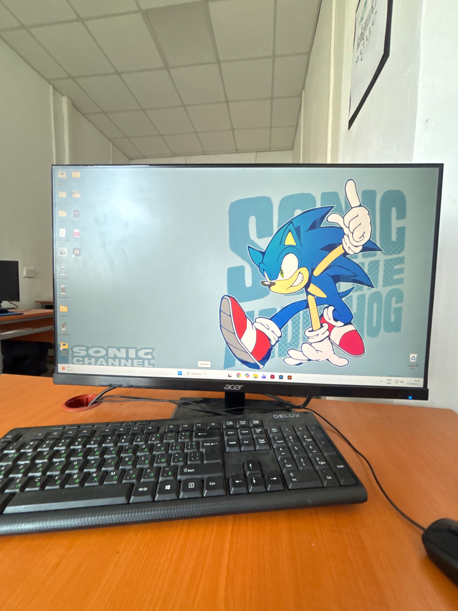 The image captures a computer workstation set up in an indoor environment, likely in Troyan, Bulgaria, as indicated by the Cyrillic characters on the keyboard and the Bulgarian word "Търсене" (Search)…read more