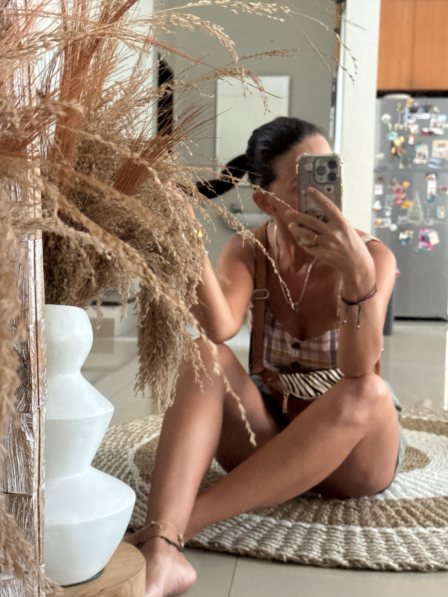A reflection of a woman is visible in a mirror. She is sitting on a rug, holding a phone, and appears to be taking a photo of herself. The reflection also shows a kitchen counter and cabinets. In the…read more