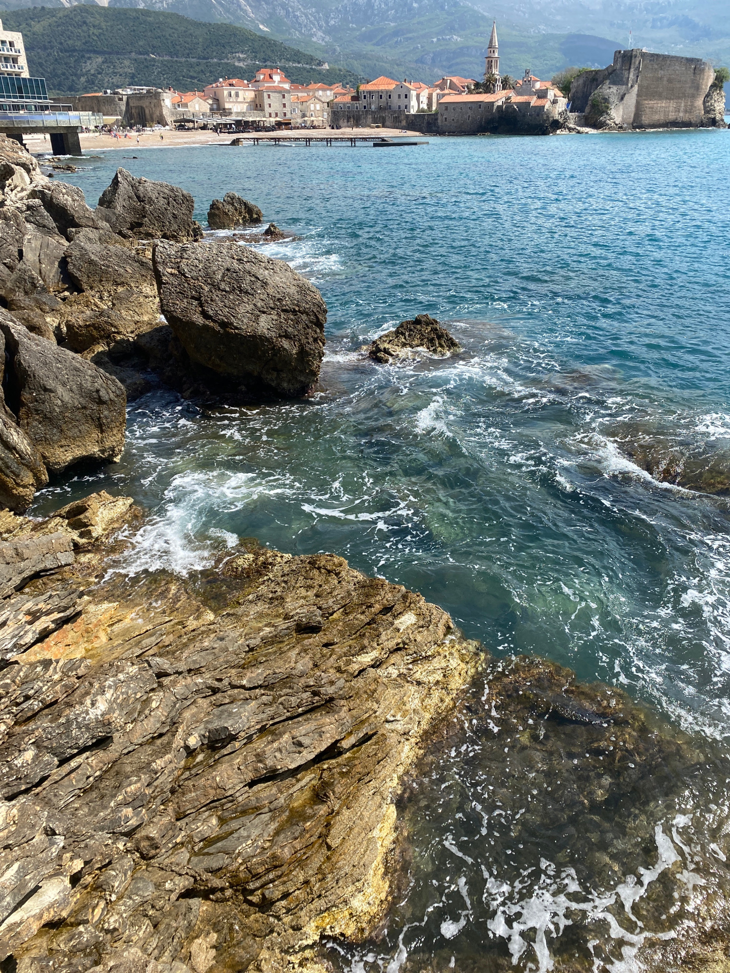 The image depicts a rocky shoreline in Budva, Montenegro, with the Adriatic Sea visible. The foreground consists of large, weathered rocks with visible striations and textures. The sea water is clear…read more