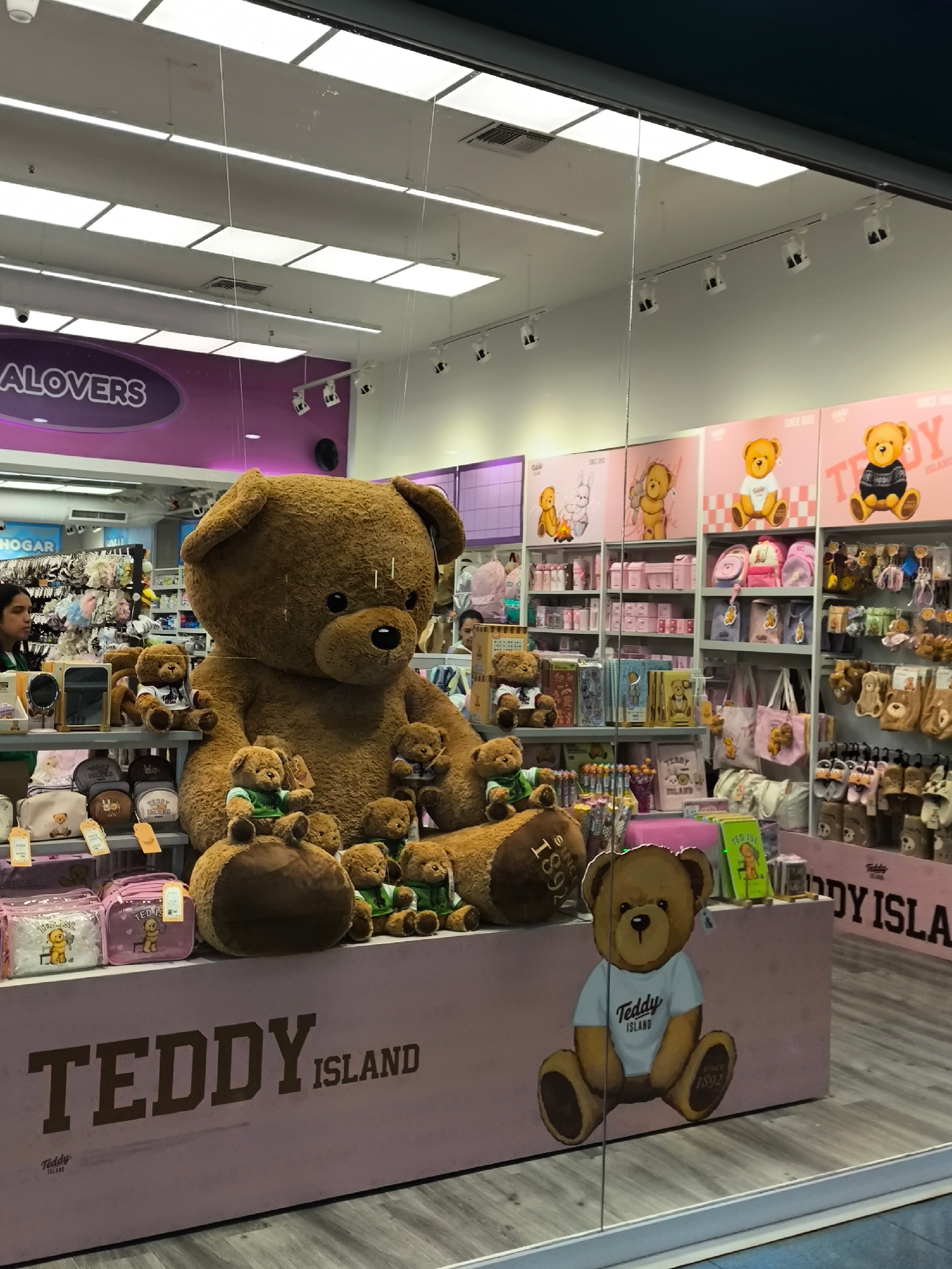 The image captures the display window of "Teddy Island," a store specializing in teddy bear-themed merchandise. A giant, brown teddy bear sits amidst smaller teddy bears wearing different colored shir…read more