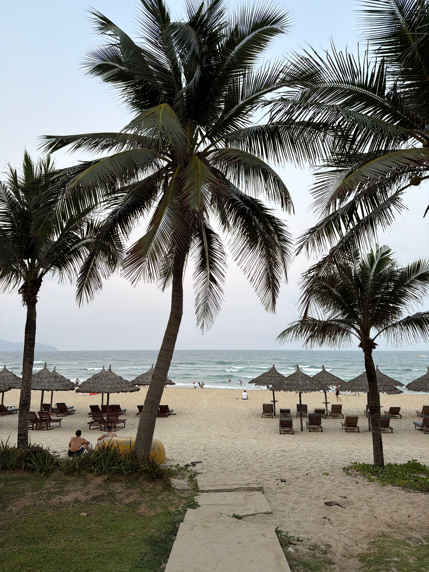 The image shows a beach scene in Đà Nẵng, Vietnam. Palm trees dominate the left of the frame. To the right of the trees is a sandy beach with rows of thatched umbrellas and lounge chairs. People are p…read more
