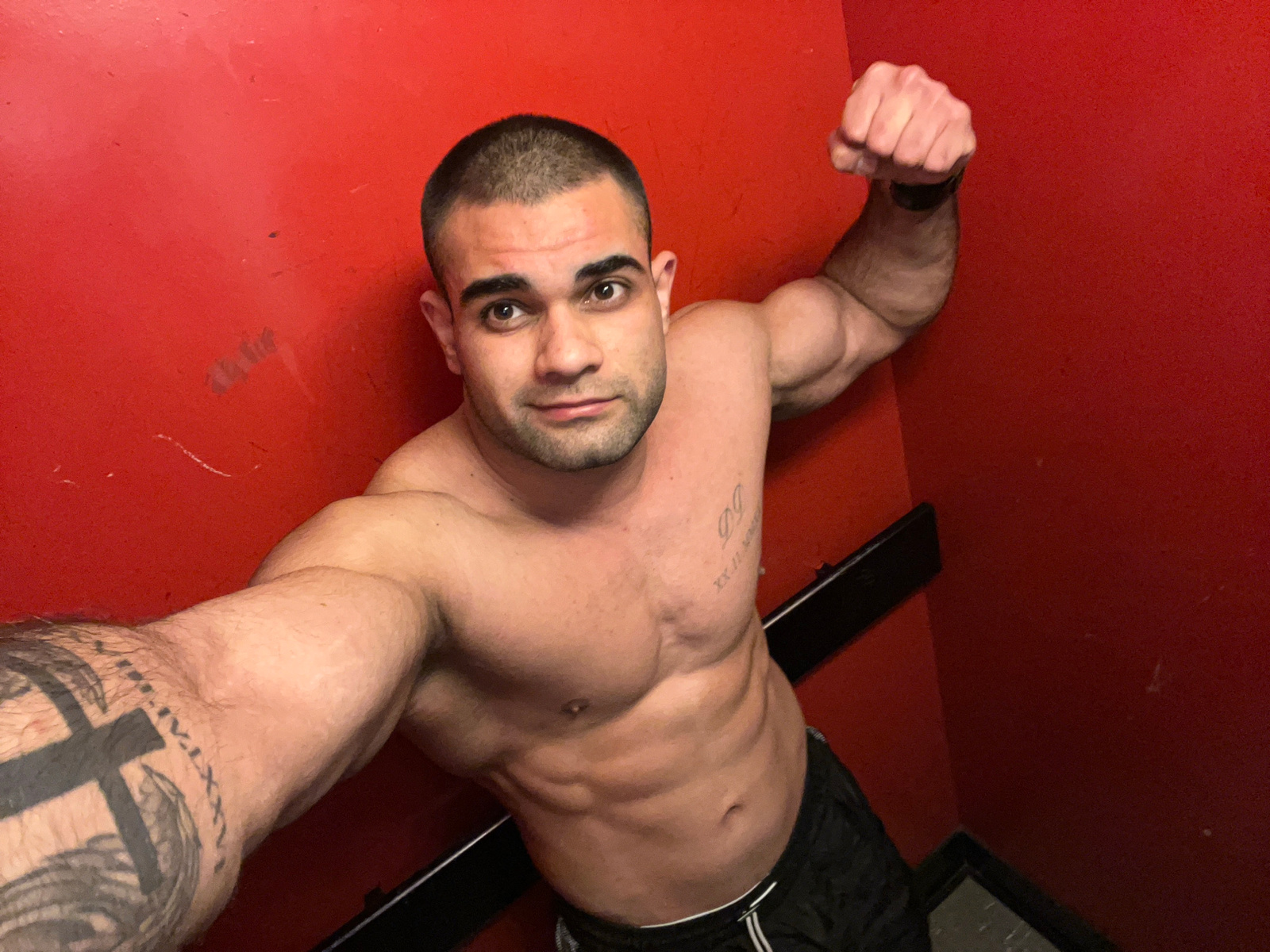 A shirtless man with a muscular build and several tattoos is posing in what appears to be a gym or fitness area. He is wearing shorts and a wristband. The background consists of red walls and some bla…read more