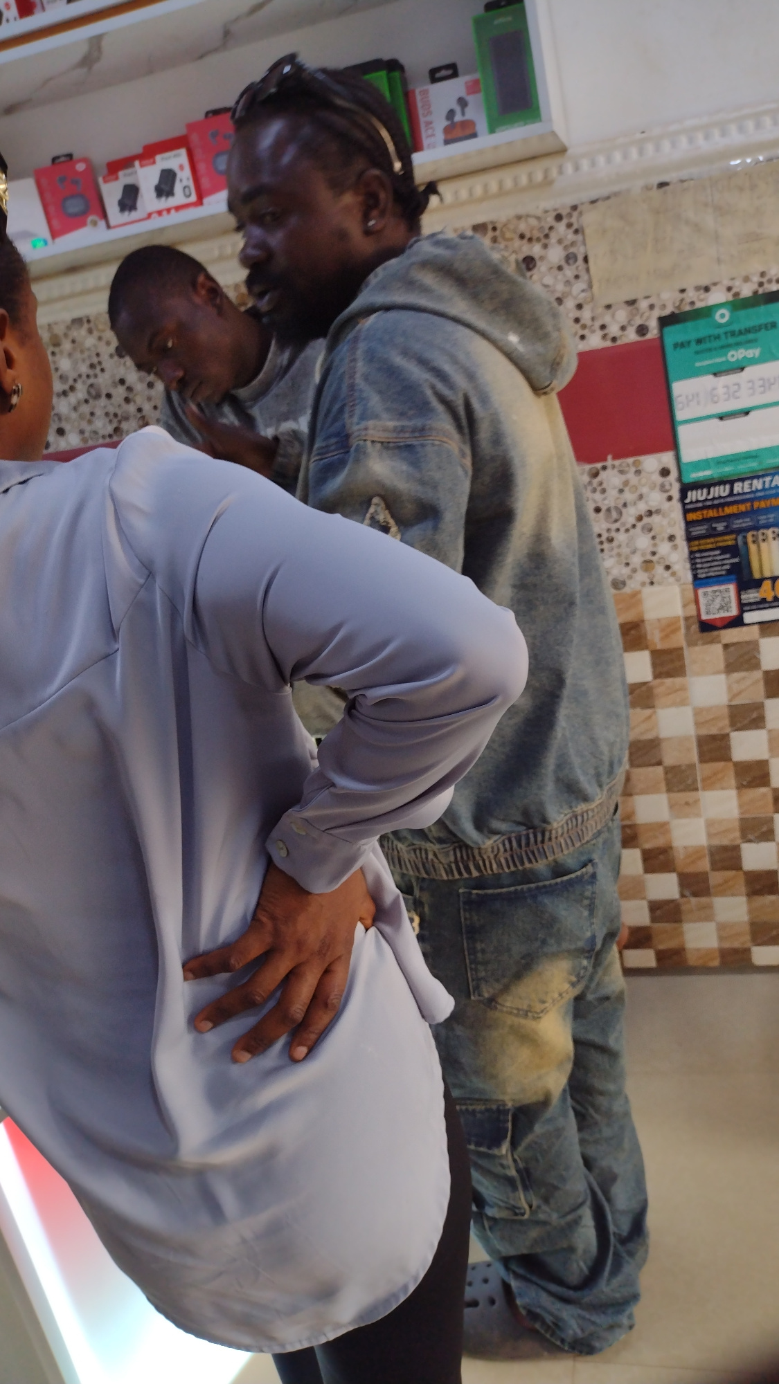 Two dark-skinned men are in a room in Jos, Nigeria. One man has braids and is wearing a denim jacket and jeans. The other man is wearing a light blue shirt. They are talking. The room has tiled walls…read more