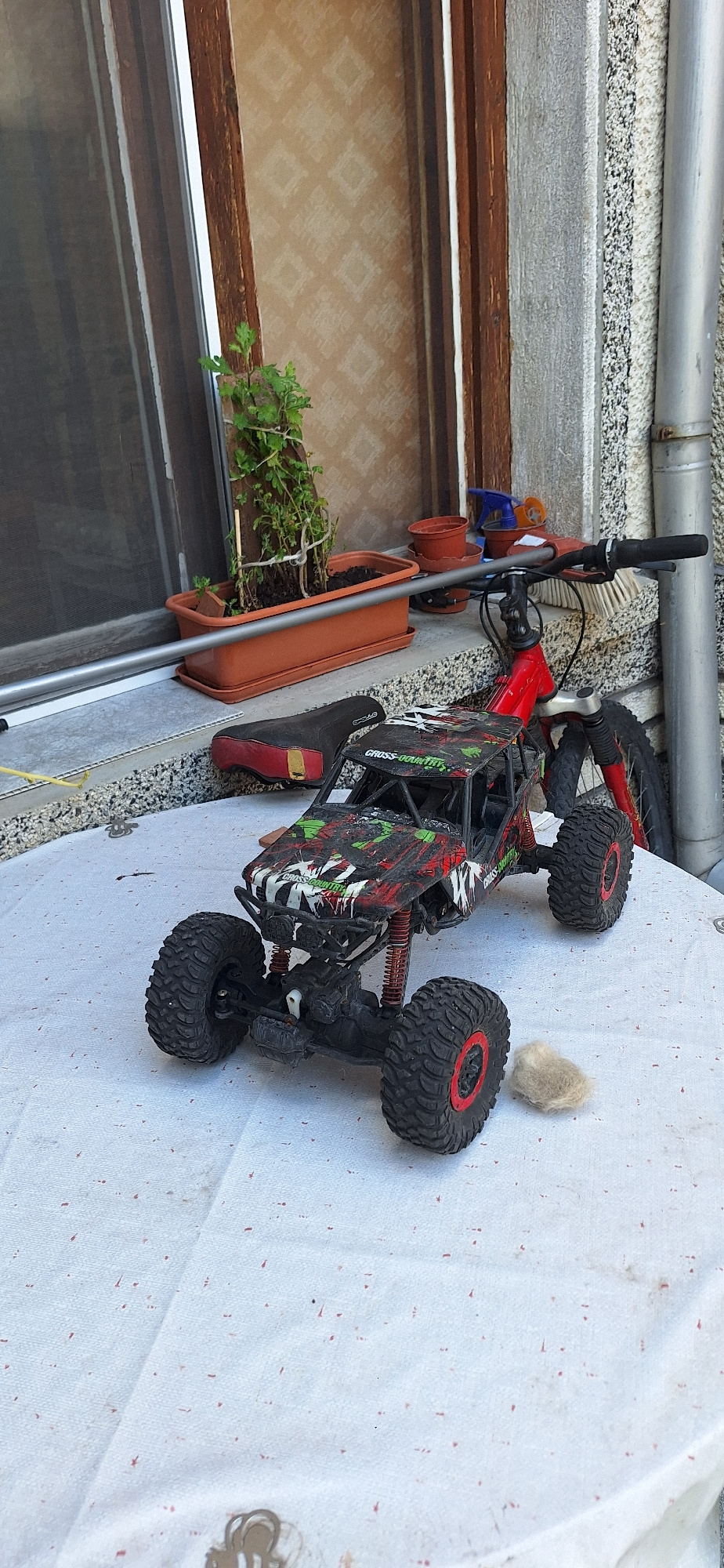 The scene depicts an outdoor setting with a building facade on the left side of the frame and a light-colored textured surface with a scattering of red specks on the right. The building facade feature…read more