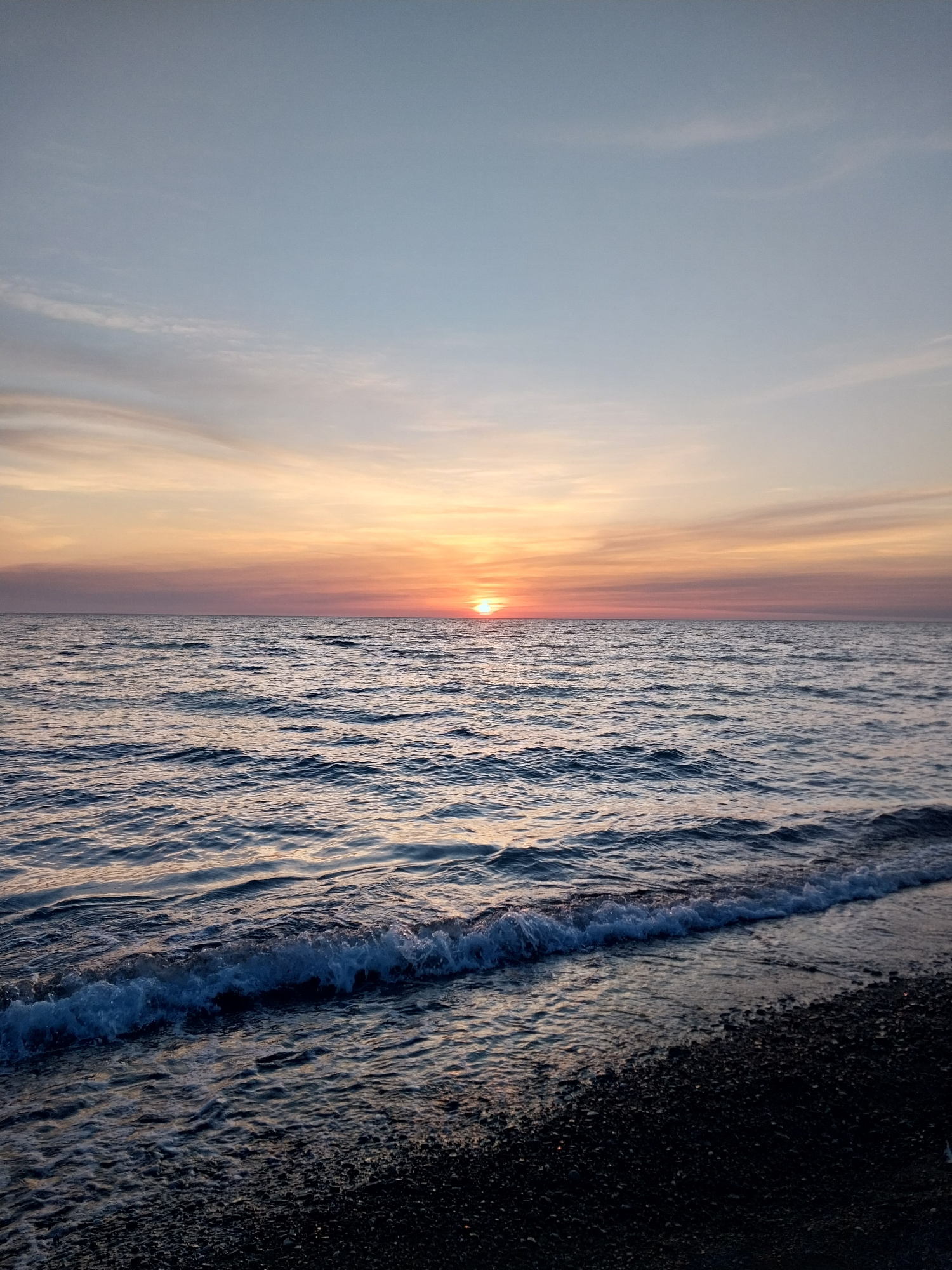 The image depicts a sunset over the Black Sea in Sochi, Russia. The sky on the left shows a gradient of light blue to orange, with soft, wispy clouds. The sun is visible on the horizon as a small, bri…read more