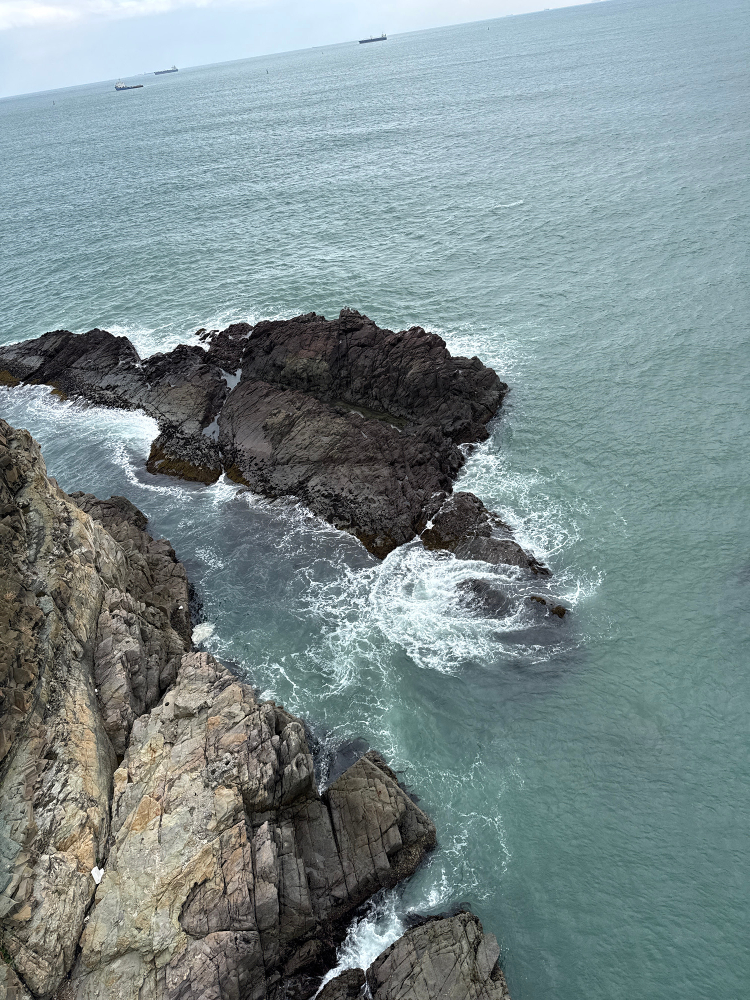 The image depicts a rocky coastline with ocean waves crashing against the rocks. In the distance, several ships are visible. The location is likely in or near Busan, South Korea, given the typical coa…read more