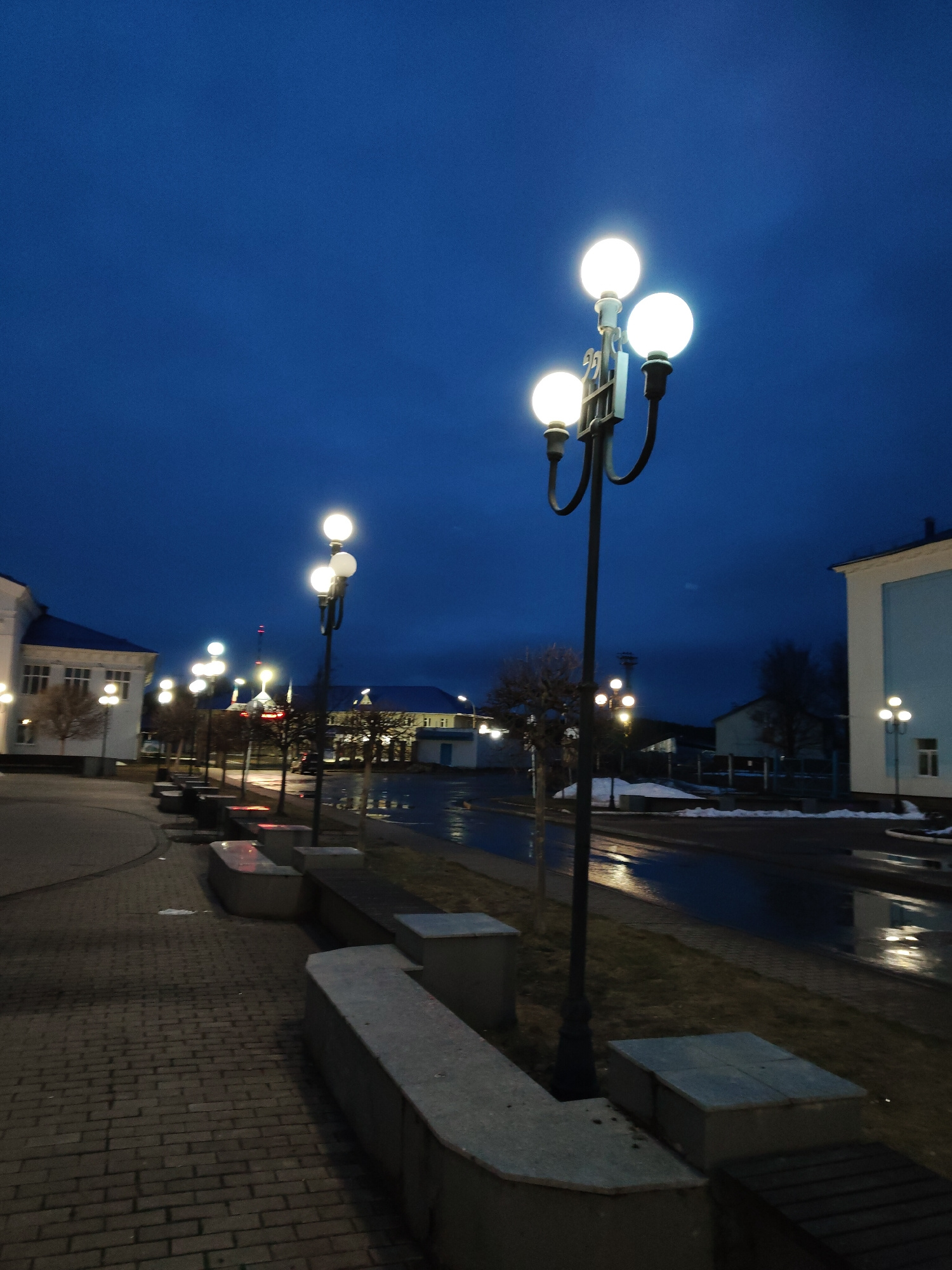 The image depicts a street scene in an unidentified city at dusk or night. The focal point is a row of ornate streetlights with three spherical bulbs each. These lights illuminate the scene, casting r…read more