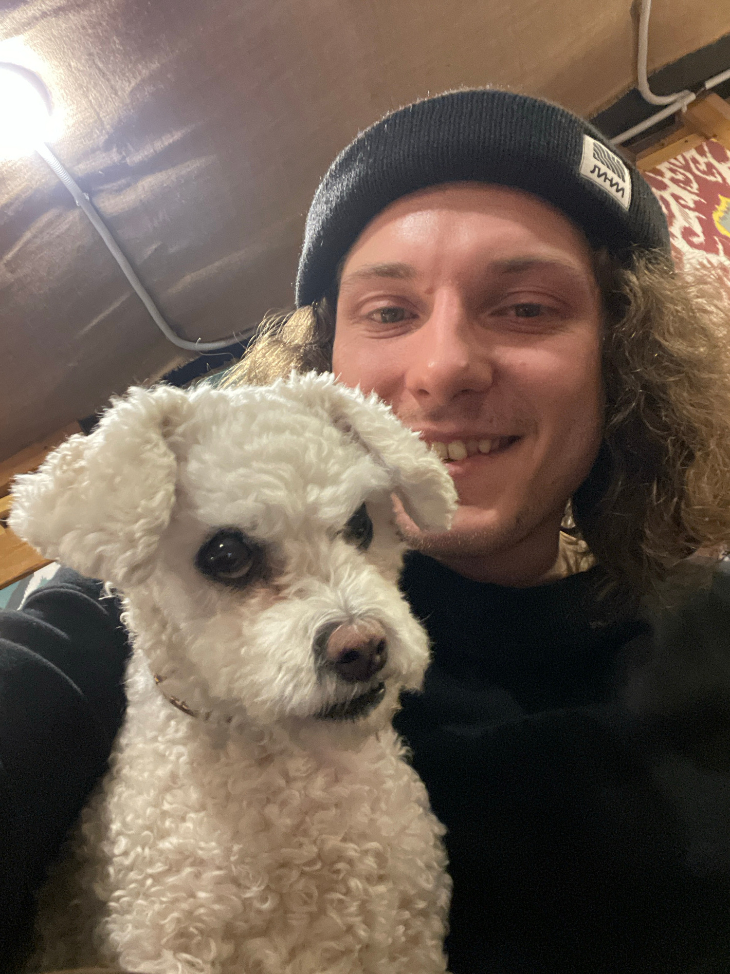 A selfie photograph shows a man with curly blond hair wearing a black beanie with a white logo, holding a small white dog. The man is smiling, and the dog is looking at the camera. The background is i…read more