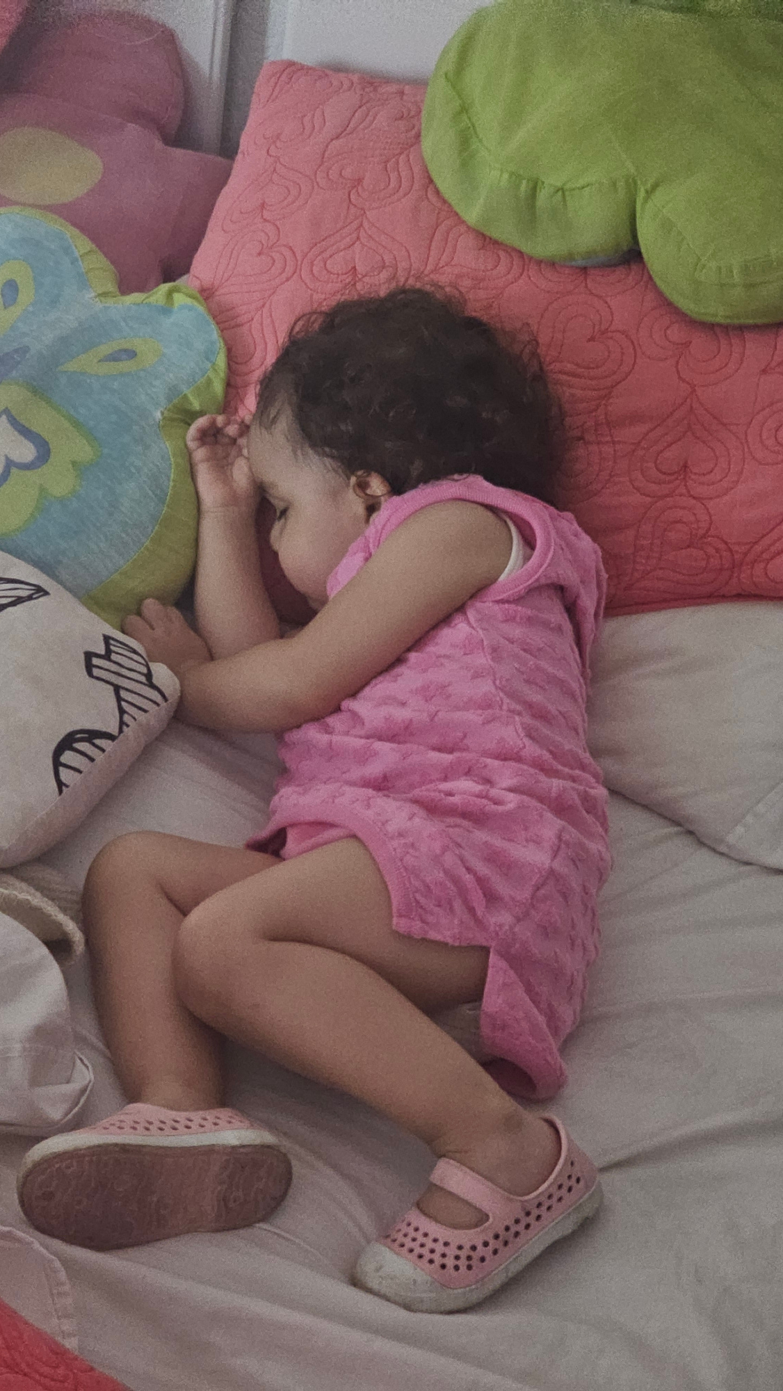 A child is lying on a bed, asleep. The child is wearing a pink dress and pink shoes, one on each foot. The bed is covered with several pillows of different colors and shapes including green, pink withβ¦read more