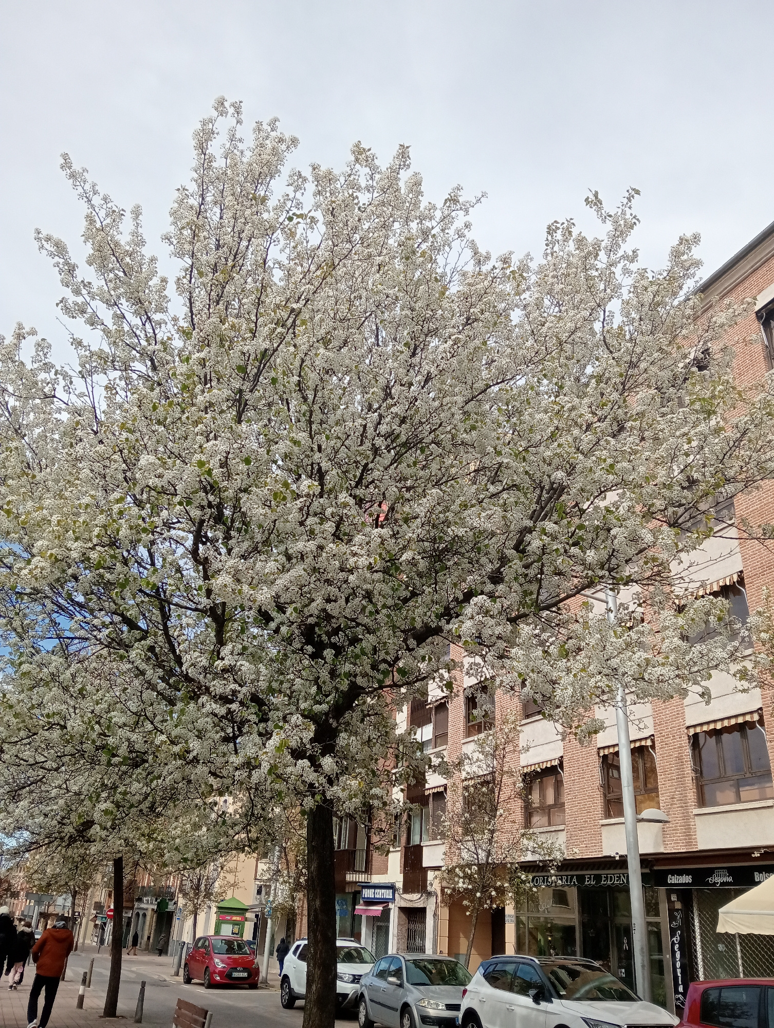 The image captures a street scene in Segovia, Spain. A large tree with white blossoms dominates the view, partially obscuring a multi-story brick building with windows and awnings. Several parked cars…read more
