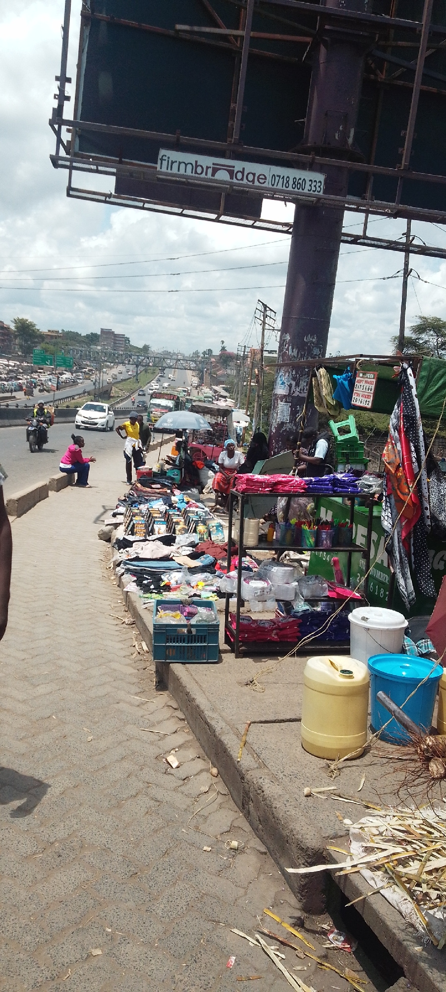 The image shows a bustling roadside scene in Nairobi, Kenya, with a congested highway visible in the background. A billboard with the word "firmbridge" and a phone number "0718 860 333" stands above a…read more