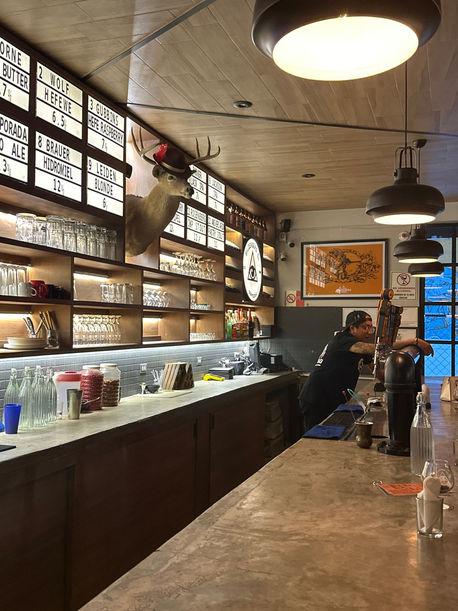 The image shows the interior of a bar, likely in San Andrés Cholula, Mexico, based on signage visible in the background (alcohol sales restrictions). A bartender stands behind a dark wooden bar with a…read more