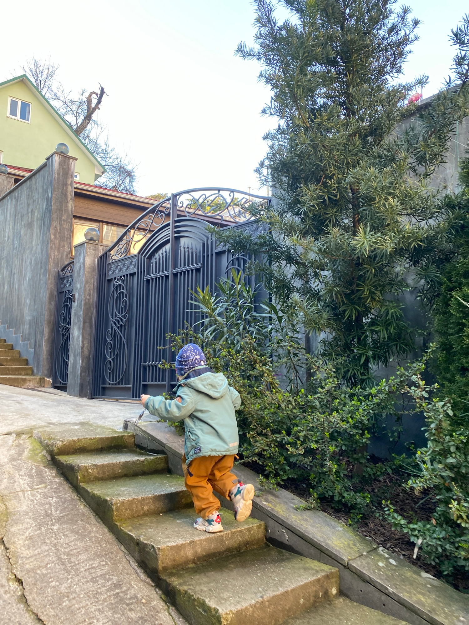 A low-angle view shows a child climbing concrete stairs, with an ornate black metal gate and green foliage in the background. The child, wearing a light green jacket, brown pants, and a blue patterned…read more