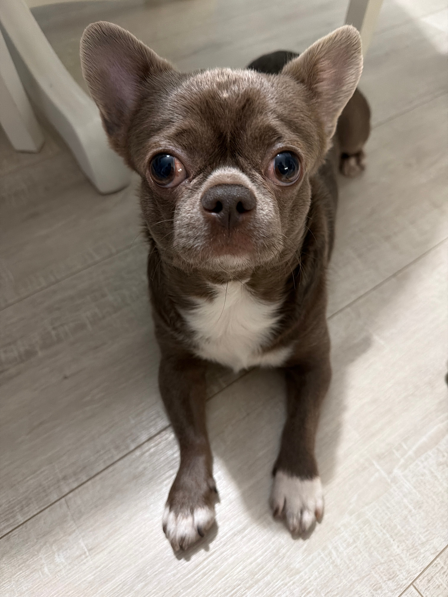 A small, brown and white Chihuahua is lying on a light-colored wooden floor. The dog is looking directly up at the camera. The front paws are extended in front of it. Part of a white chair leg is visi…read more