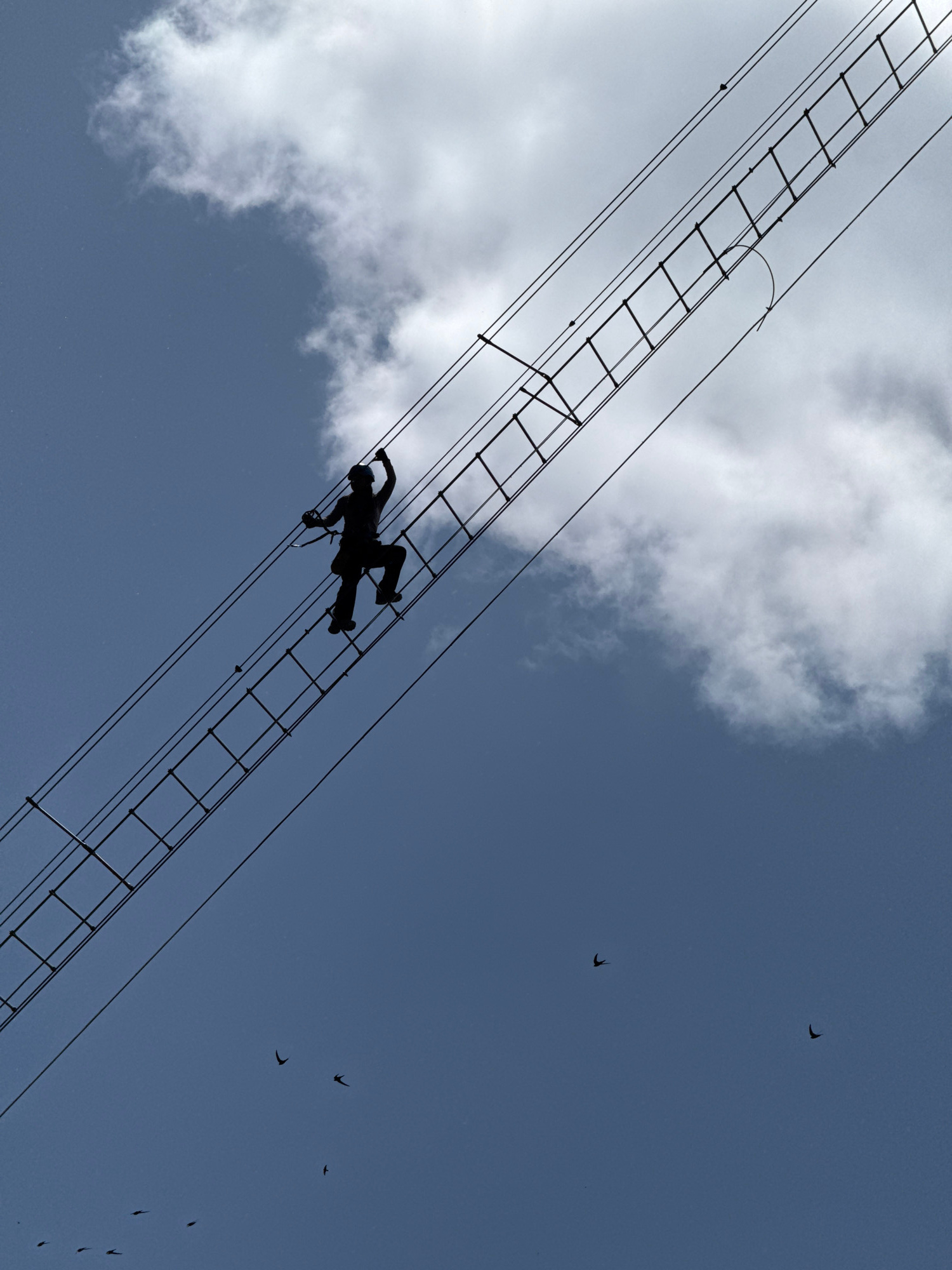 A low-angle shot shows a silhouetted figure on a suspension bridge against a backdrop of clouds and a blue sky in Yongding District, China. The figure appears to be lying face-down on the bridge's lad…read more