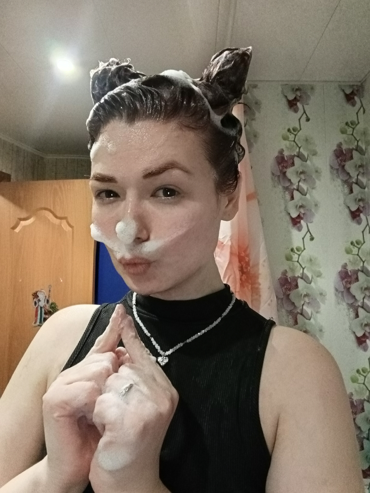 A woman is posing for a selfie in an indoor location. She is wearing a black, sleeveless top and a necklace with a heart-shaped pendant. Her dark hair is styled in two buns on top of her head, with so…read more