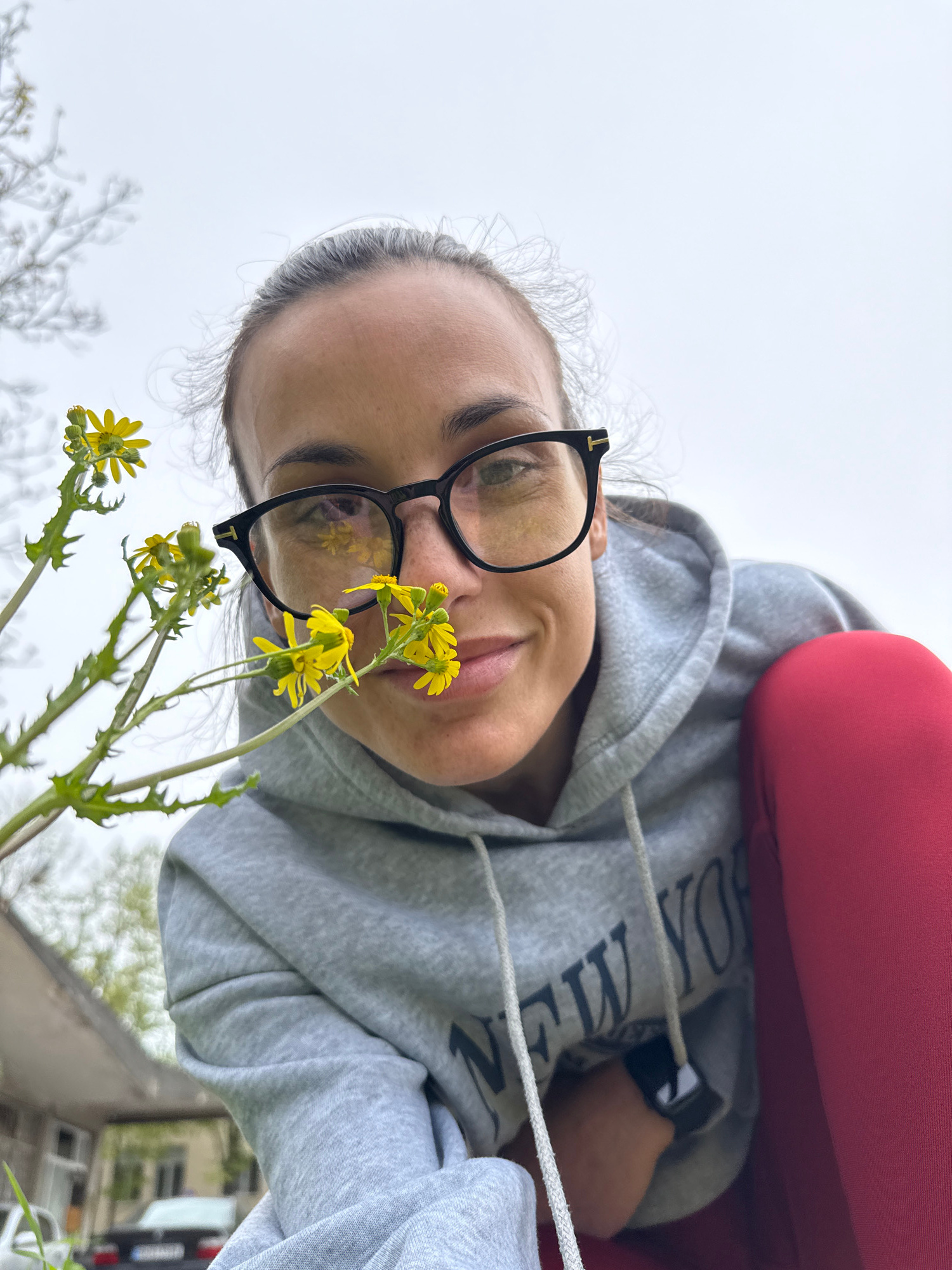 A low-angle, portrait-style photograph captures a woman looking downwards into the camera, with a gentle smile. She is seen from the chest up, positioned against an overcast, light grey sky. Her headβ¦read more
