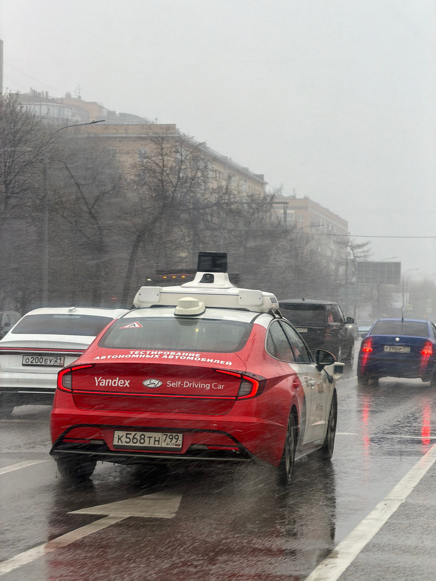 The image shows a red Yandex self-driving car in Moscow, Russia, amidst heavy rain. The car is stationary on a street marked with white lines, part of a traffic queue that includes a blue car and a bl…read more