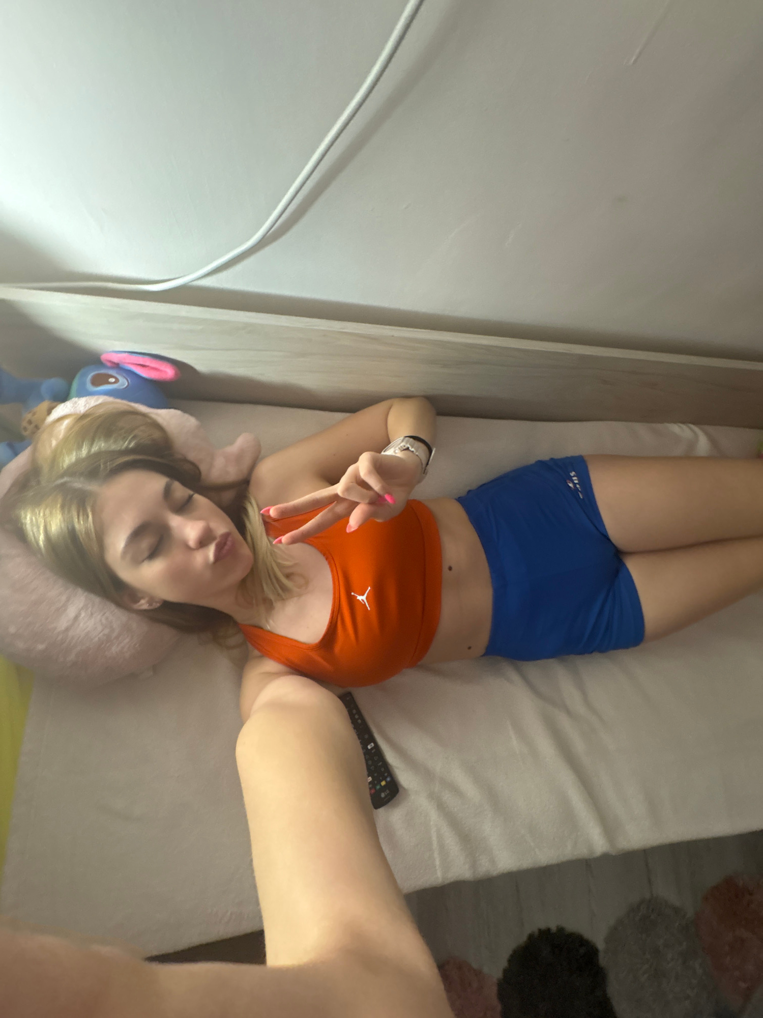 A young woman with blonde hair, appearing to be in her late teens or early twenties, lies on her back on a bed in what appears to be a bedroom. She is dressed in an orange sleeveless sports top, which…read more