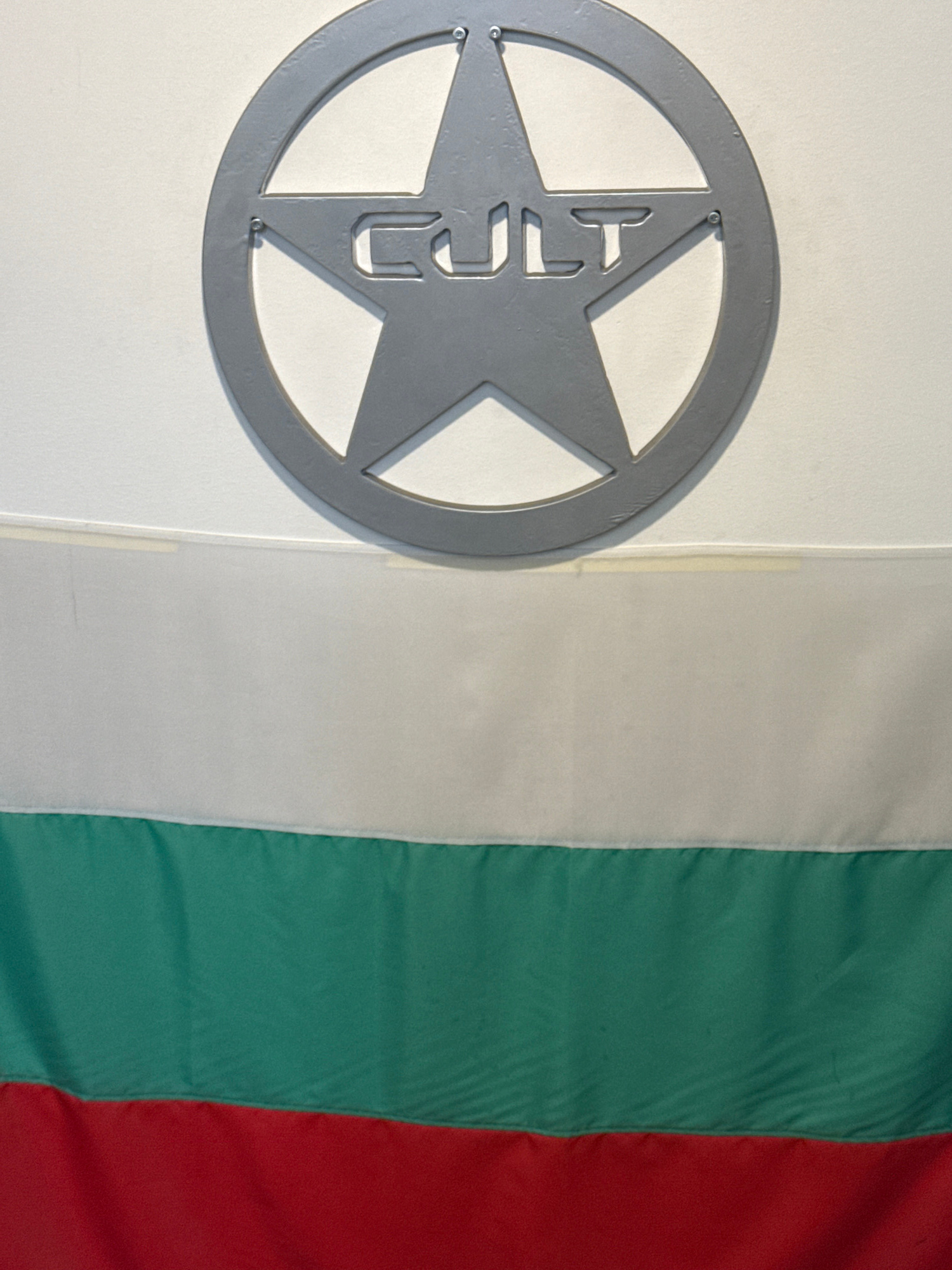 The image captures a static display featuring a metallic emblem and a tricolor flag. On the left side of the frame, a gray metallic emblem is mounted on a plain white surface. The emblem is circular,…read more