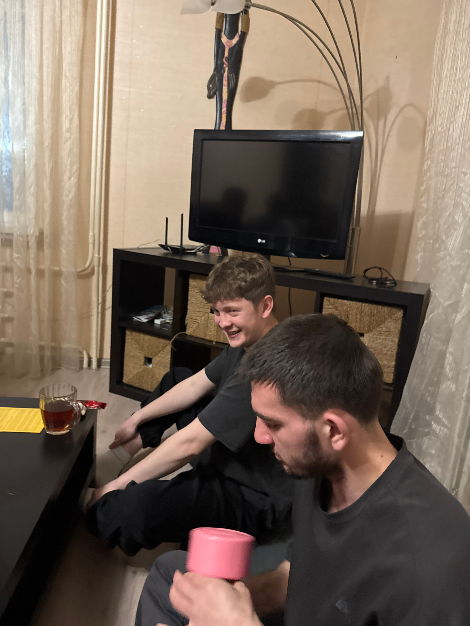 Two men are seated on the floor in an interior setting, likely a living room. A television is visible in the background, placed on a black entertainment center with wicker baskets. A cup and other ite…read more