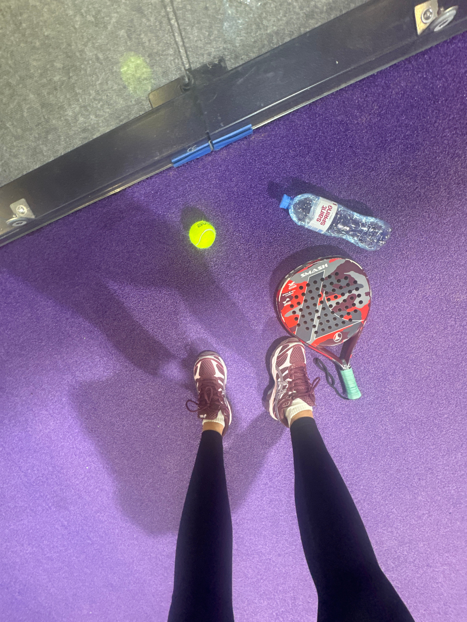 This overhead shot captures a person's lower legs and feet standing on a vibrant purple artificial turf court, indicative of a padel court. To the left, a dark grey textured surface meets the purple c…read more