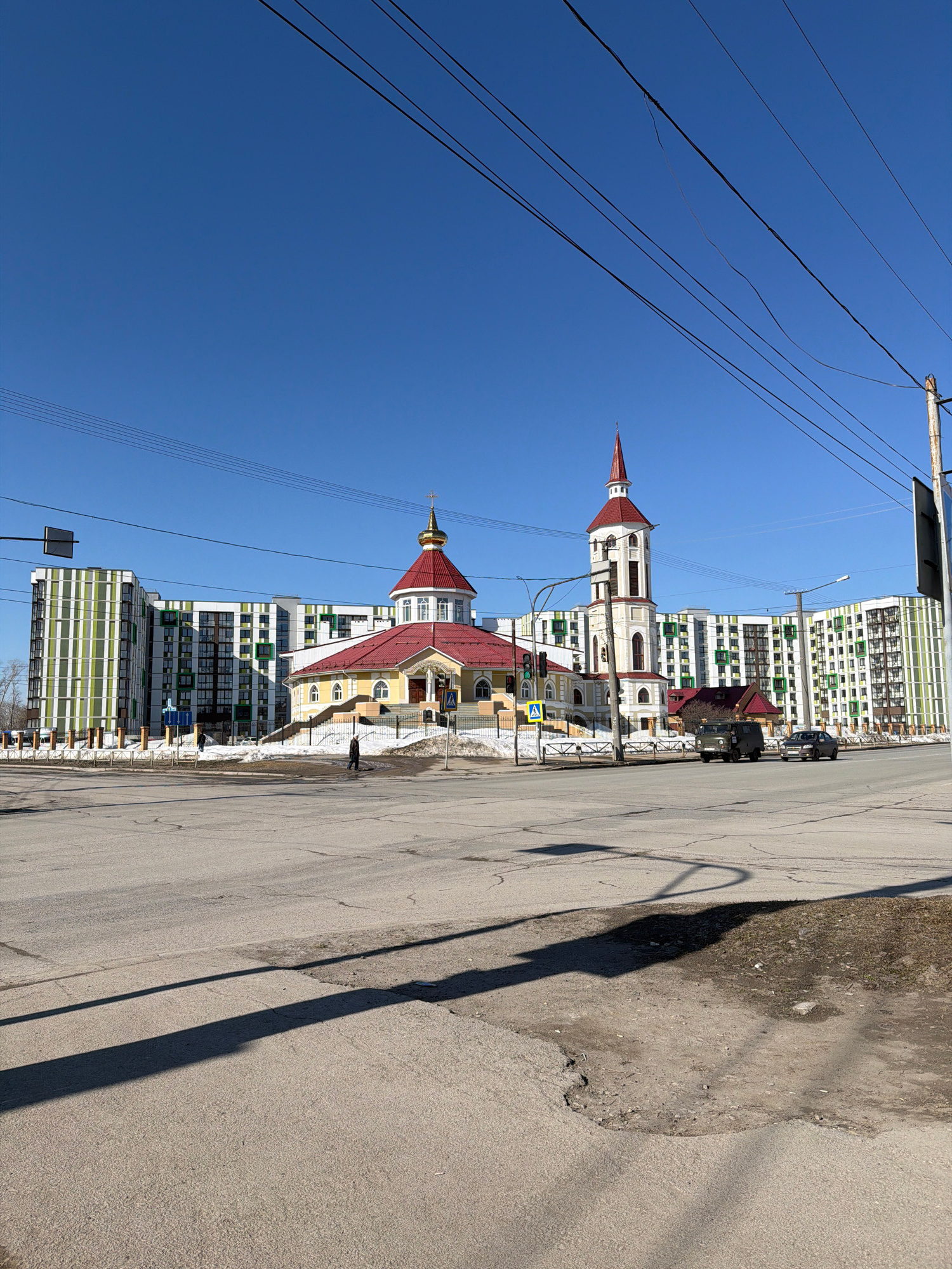 A low-angle, sunlit outdoor shot depicts a street scene in Berezniki, Russia, featuring a distinct church architecture set against a backdrop of modern residential buildings. The church, with its red-…read more