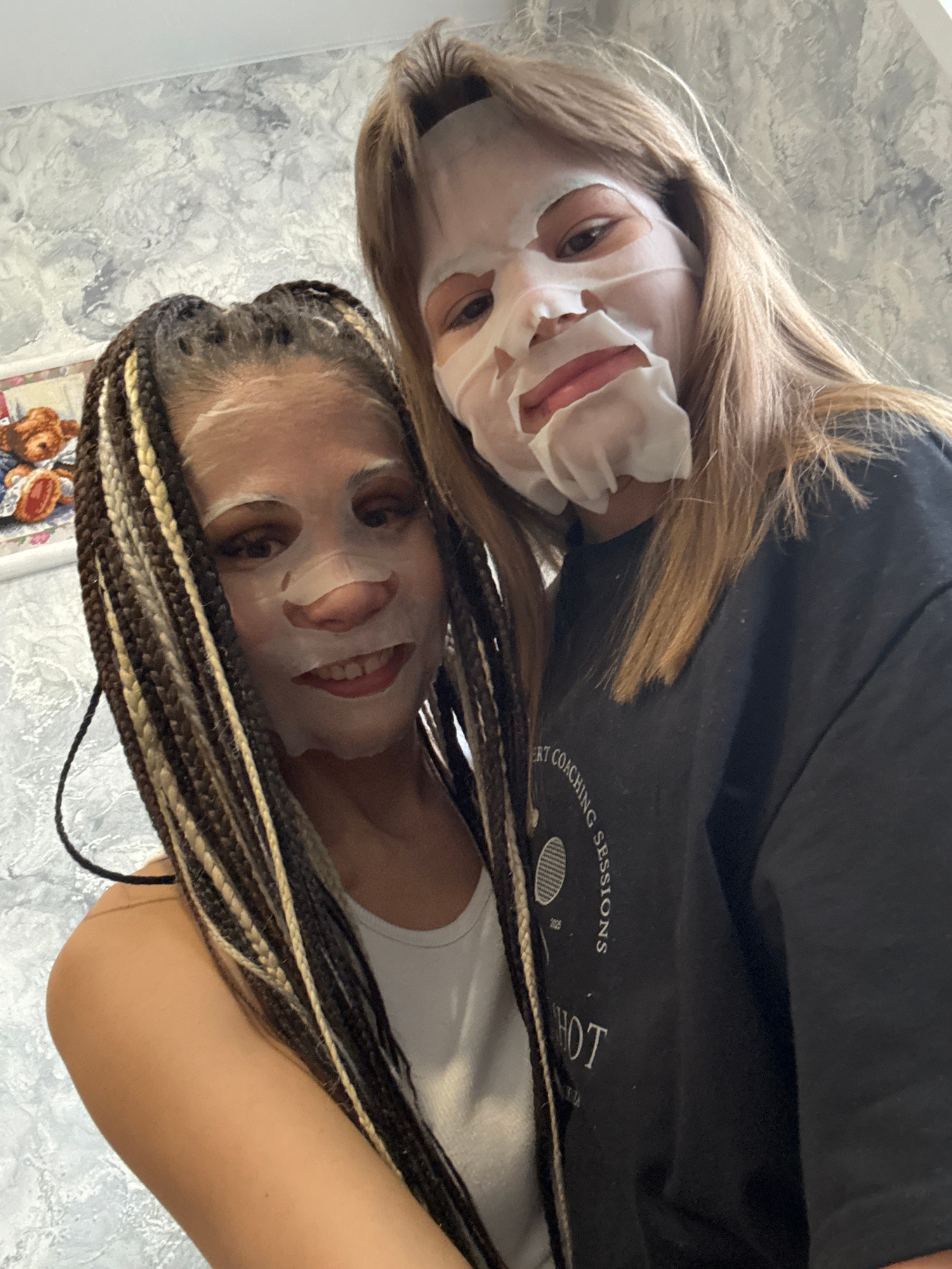 Two young women are posing close together for a selfie indoors, both wearing facial sheet masks. The first woman has shoulder-length blonde hair and is wearing a black t-shirt with white lettering thaβ¦read more