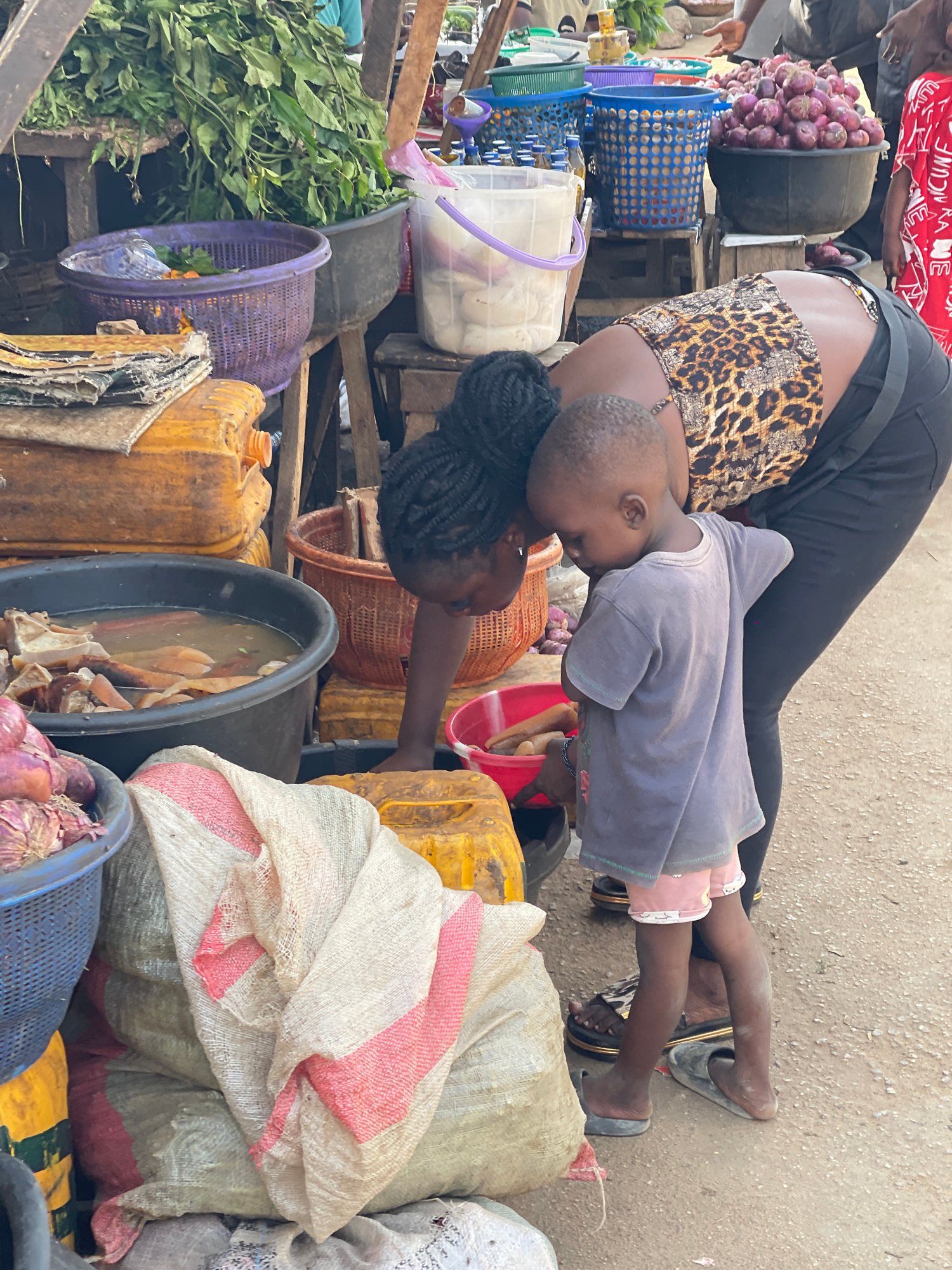 This full-shot image, captured in Kuchingoro, Nigeria, depicts a bustling outdoor market scene during daylight hours. The primary subjects are a woman and a young child, likely her child. The woman, s…read more