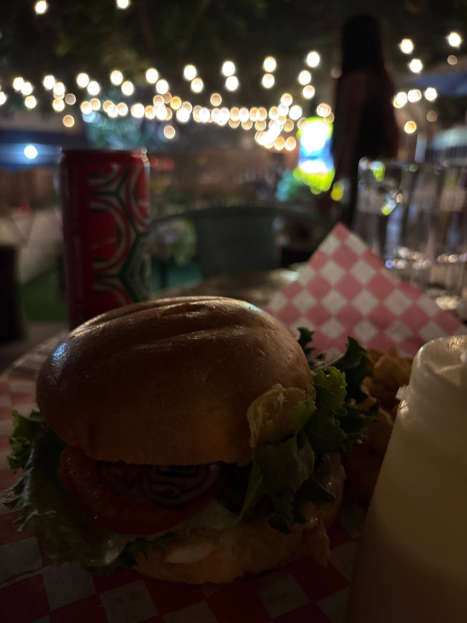 The image shows a hamburger served on a red and white checkered paper, presumably on a table in an outdoor setting. The burger appears to have lettuce, tomato, and onion visible. The background is blu…read more
