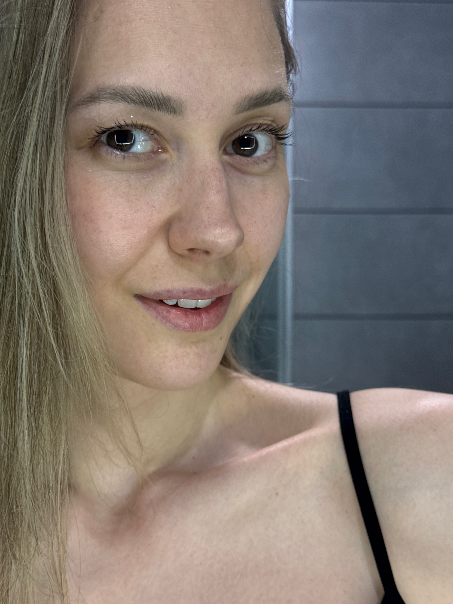 A woman with fair skin and light brown hair is lying on a surface, facing the camera with a slight smile. She has brown eyes and appears to be wearing minimal makeup. A thin, black strap is visible ac…read more