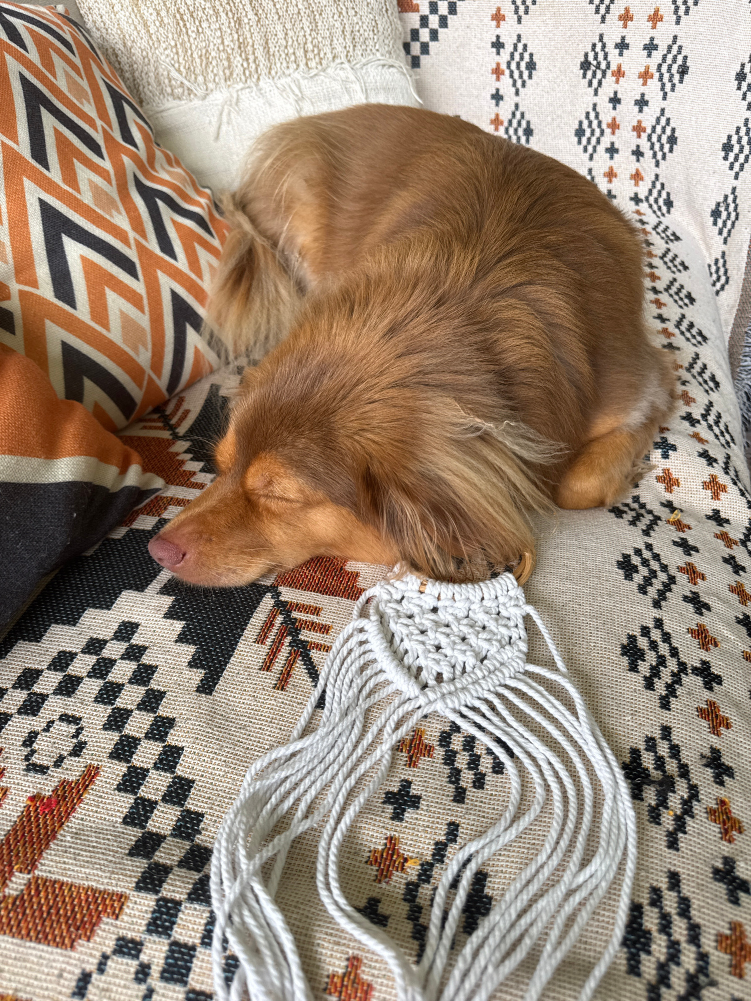 A long-haired, reddish-brown dachshund dog is curled up asleep on a pillow and fabric surface in what appears to be an indoor setting in the Ubud District, Indonesia. The pillow is patterned with an o…read more
