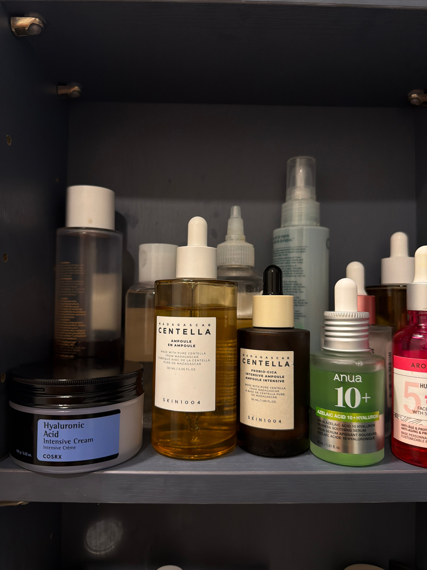 A top-down shot reveals a shelf within a cabinet, stocked with various skincare products. Notable brands and products include COSRX Hyaluronic Acid Intensive Cream, SKIN1004 Madagascar Centella Ampoul…read more