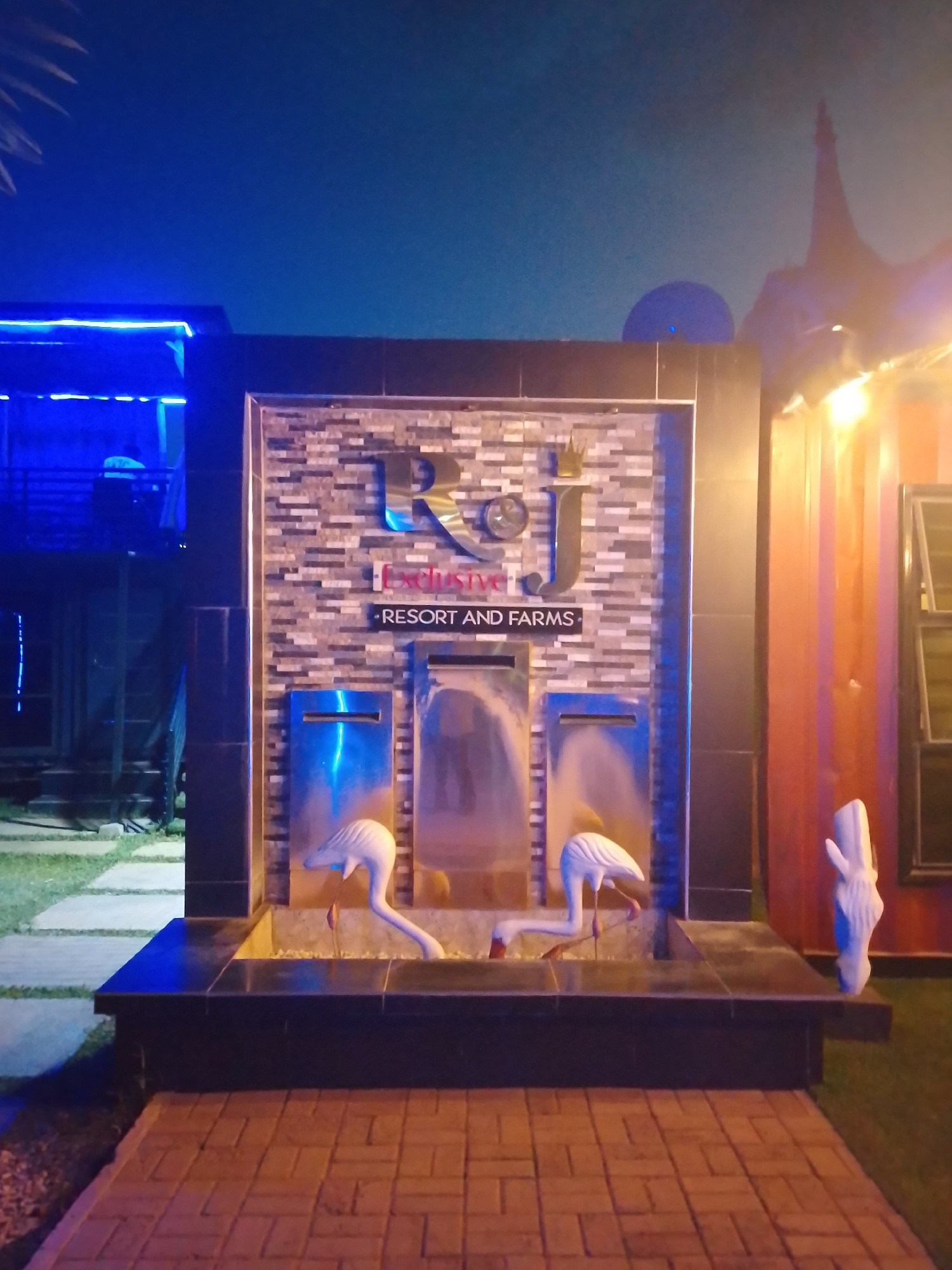 The image shows a fountain in front of the "RJ Exclusive Resort and Farms" in Rido, Nigeria. The fountain has a brick-like background with the resort's name and logo. Three vertical metal panels are i…read more