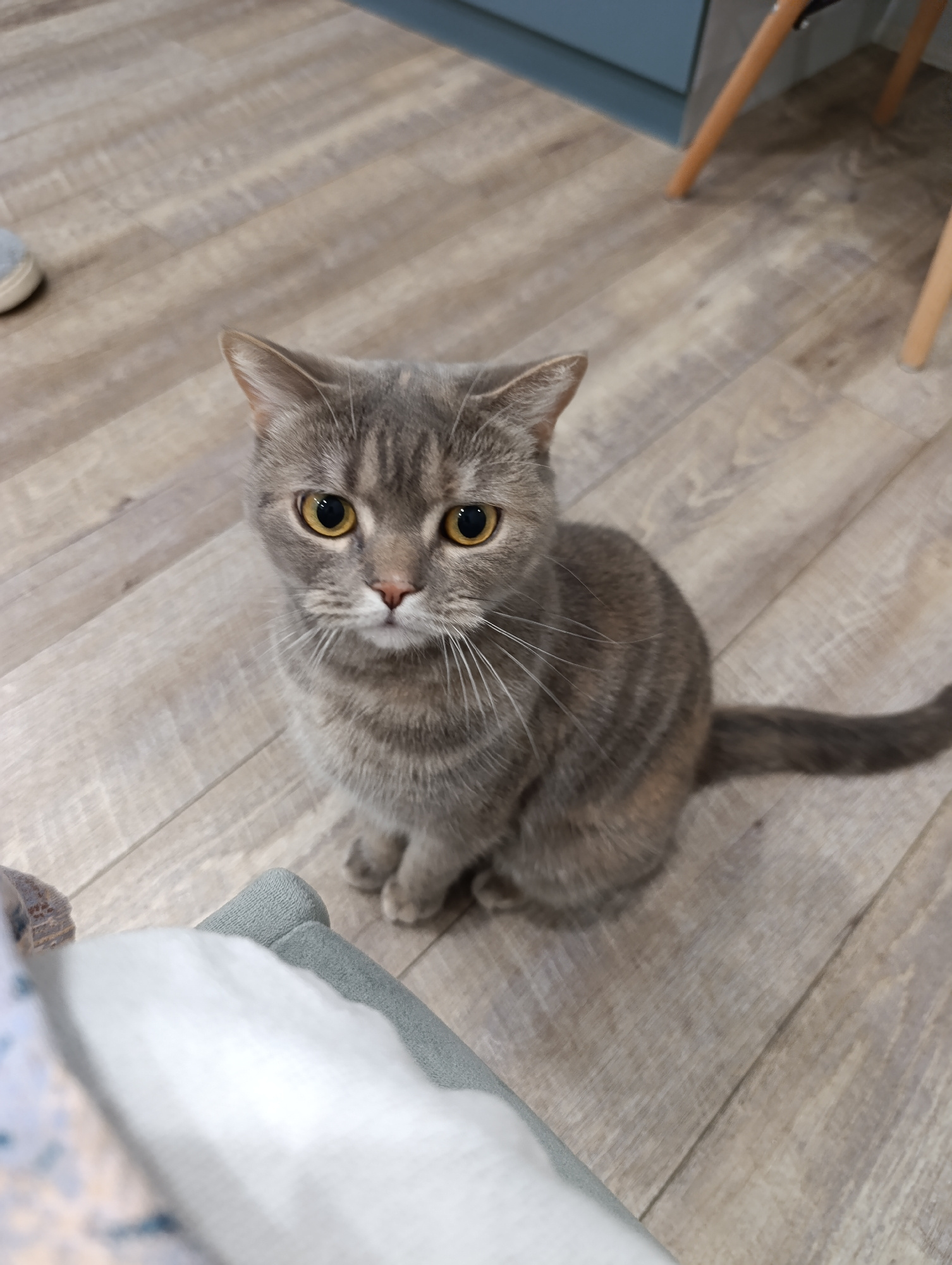 A grey tabby cat with yellow eyes sits on a wood-look laminate floor. A white and blue patterned blanket partially obscures the lower left corner of the image. A chair leg is visible in the upper righ…read more