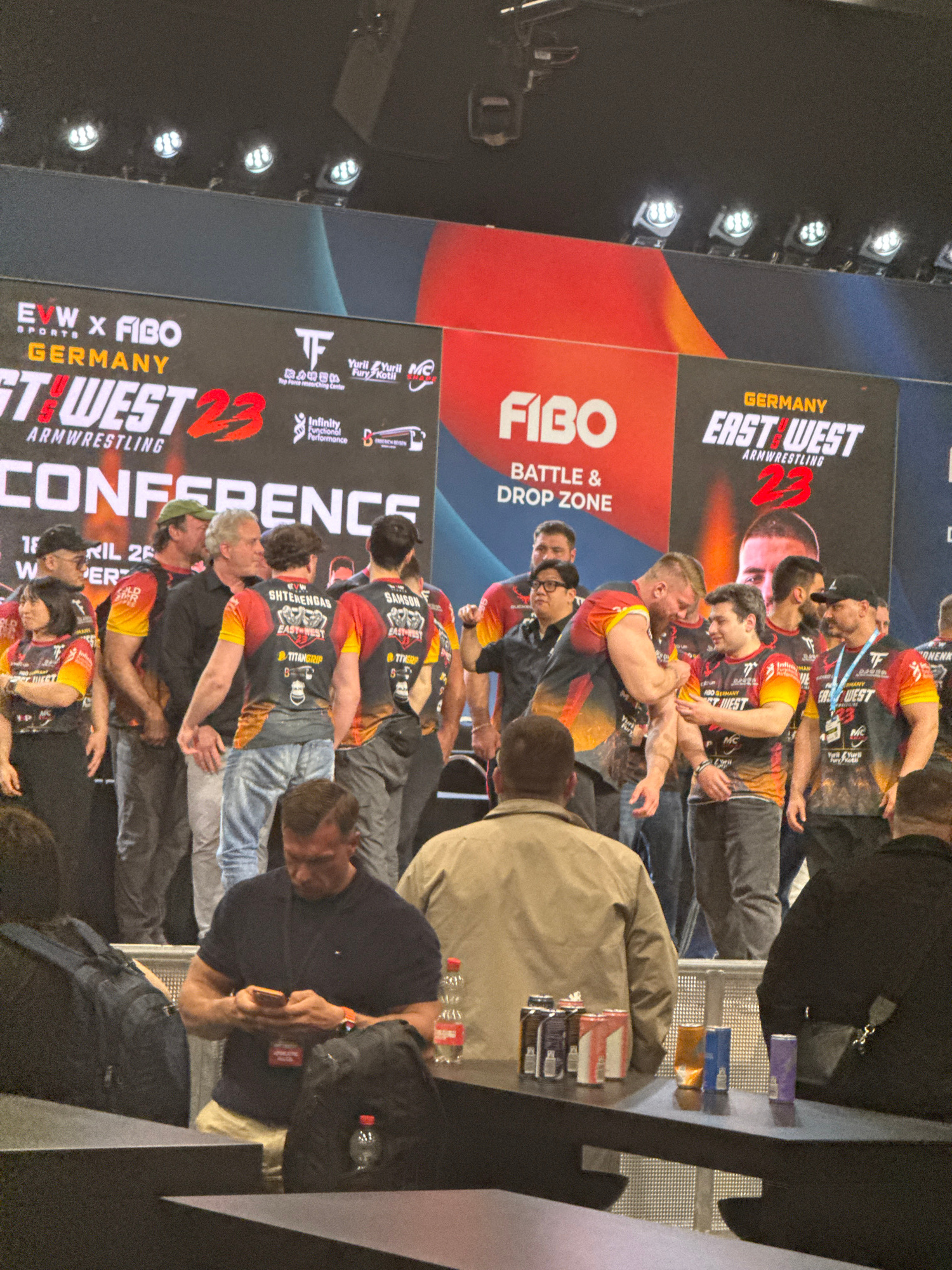 The image depicts a scene at the East vs. West Armwrestling conference in Cologne, Germany. A large banner with the event logo and sponsors is visible in the background, including brands such as FIBO…read more