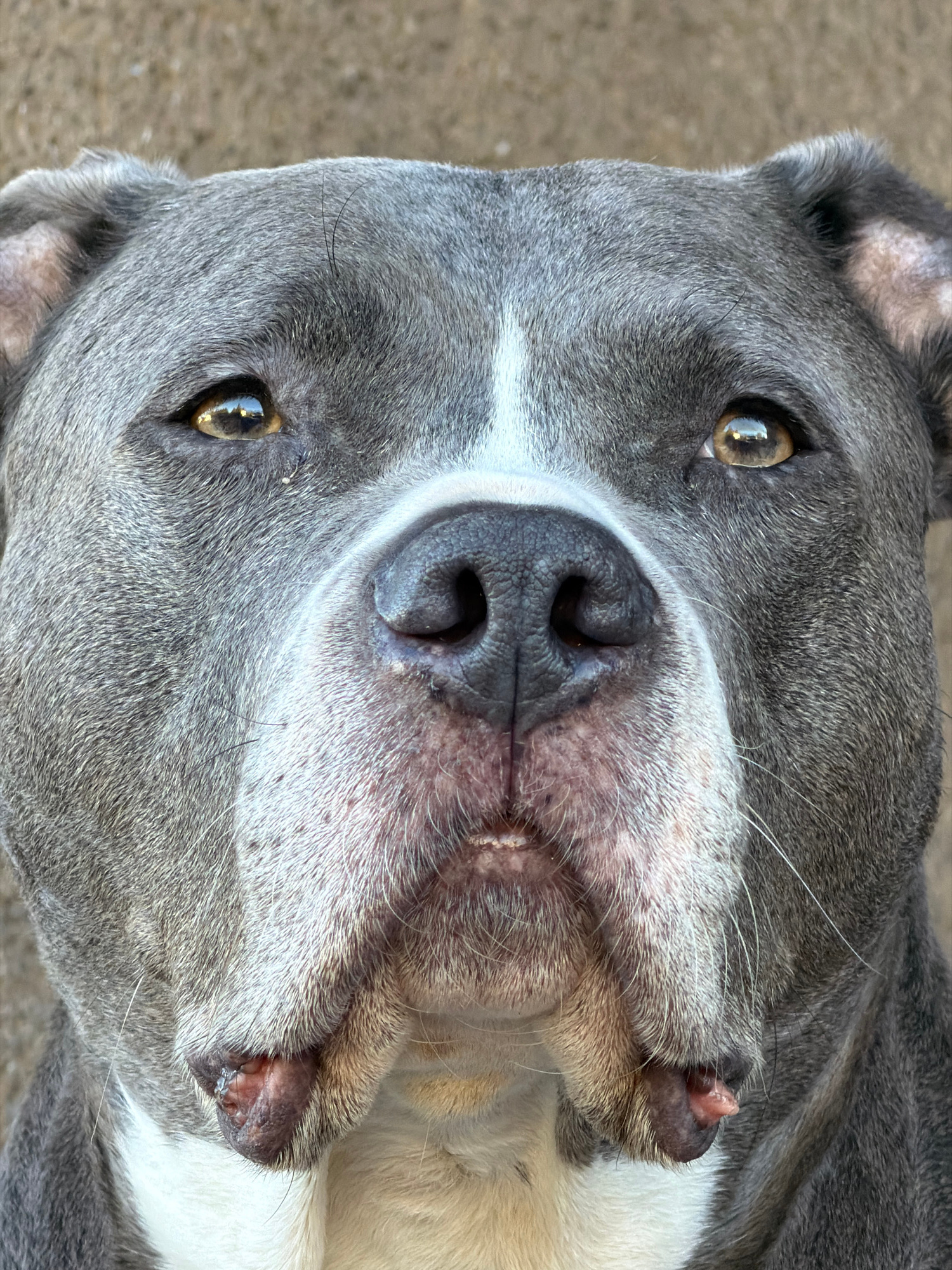 A close-up shot of a gray and white pitbull-type dog. The dog is lying on its back, facing the camera. The dog's nose is large and black, and its eyes are amber. The dog's fur is short and dense. Theβ¦read more