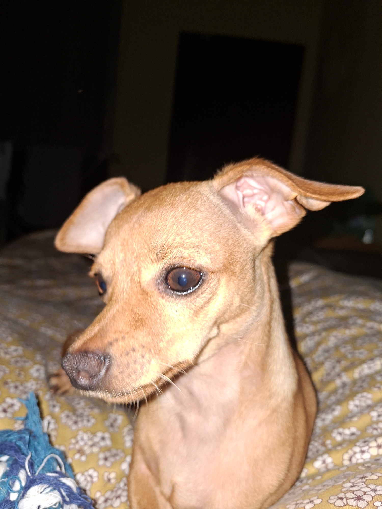 A tan-colored dog, possibly a dachshund or similar breed, is positioned on patterned bedding. The dog is facing towards the lower right of the frame, with its head tilted upward. The dog's ear is erec…read more