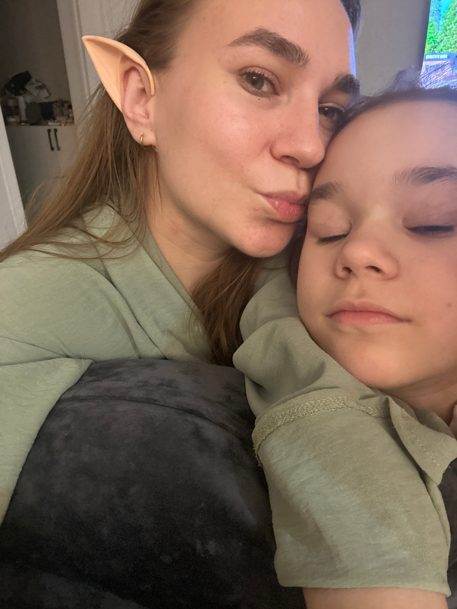 Two people are visible in the image. One is awake with one brown eye fully visible, wearing a prosthetic elf ear and a light green top. The other is asleep with their eyes closed, wearing a similar li…read more