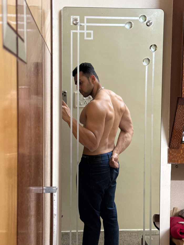 The image displays a mirror selfie of a shirtless, muscular man, presented in a horizontal orientation. The man is seen in the reflection of a rectangular mirror that features an etched decorative borβ¦read more