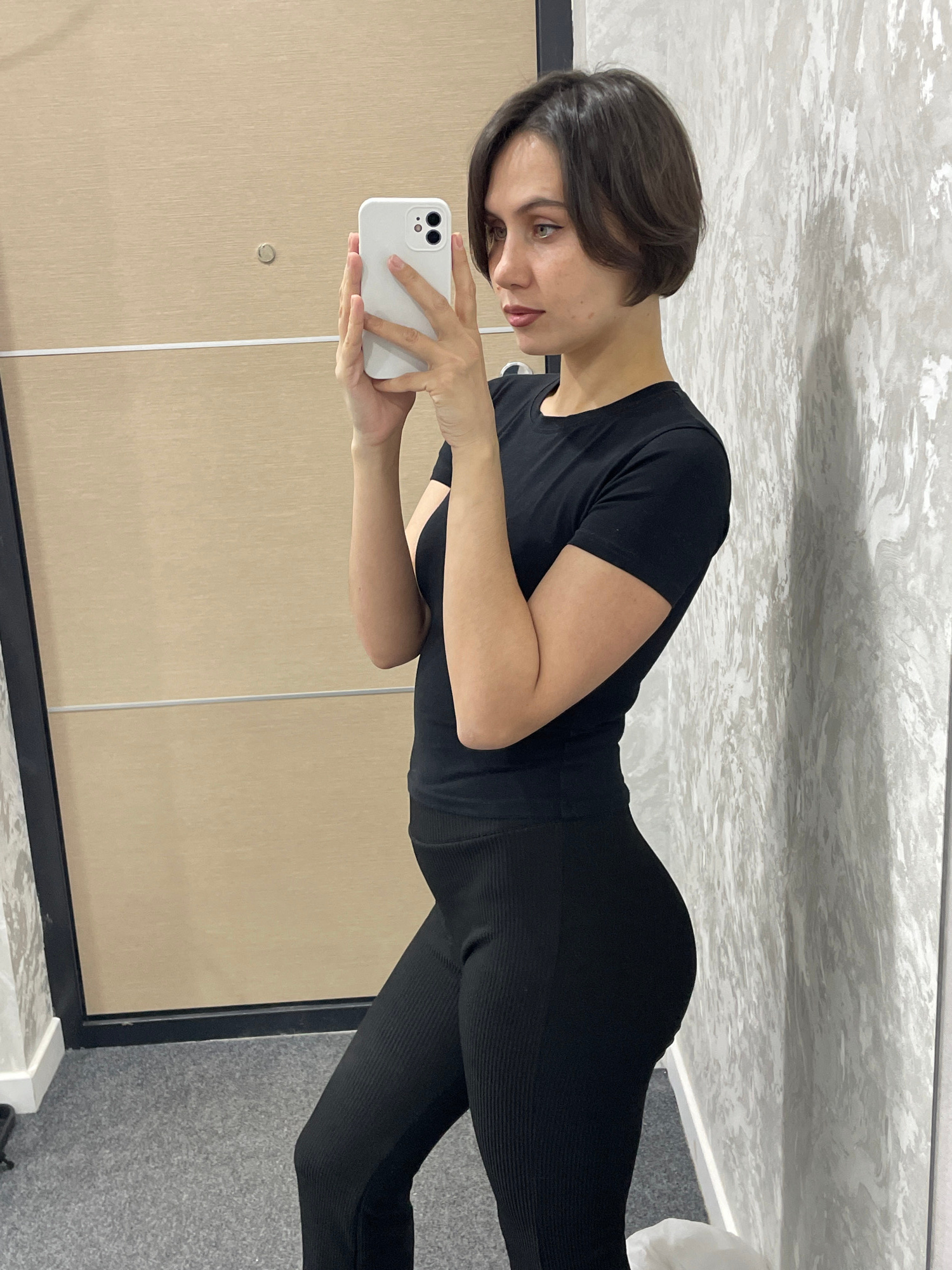 A woman with short brown hair wearing black athletic clothing is taking a selfie in front of a full-length mirror. She is holding a white smartphone. The environment appears to be a room with light be…read more