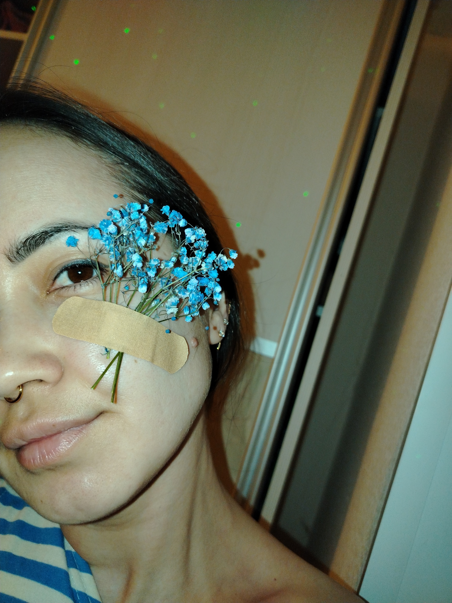 A close-up shot features a woman with dark hair. A bandage is placed on her cheek, covering part of her eye. Blue flowers are affixed near the bandage. She has a nose ring in her left nostril and earrβ¦read more