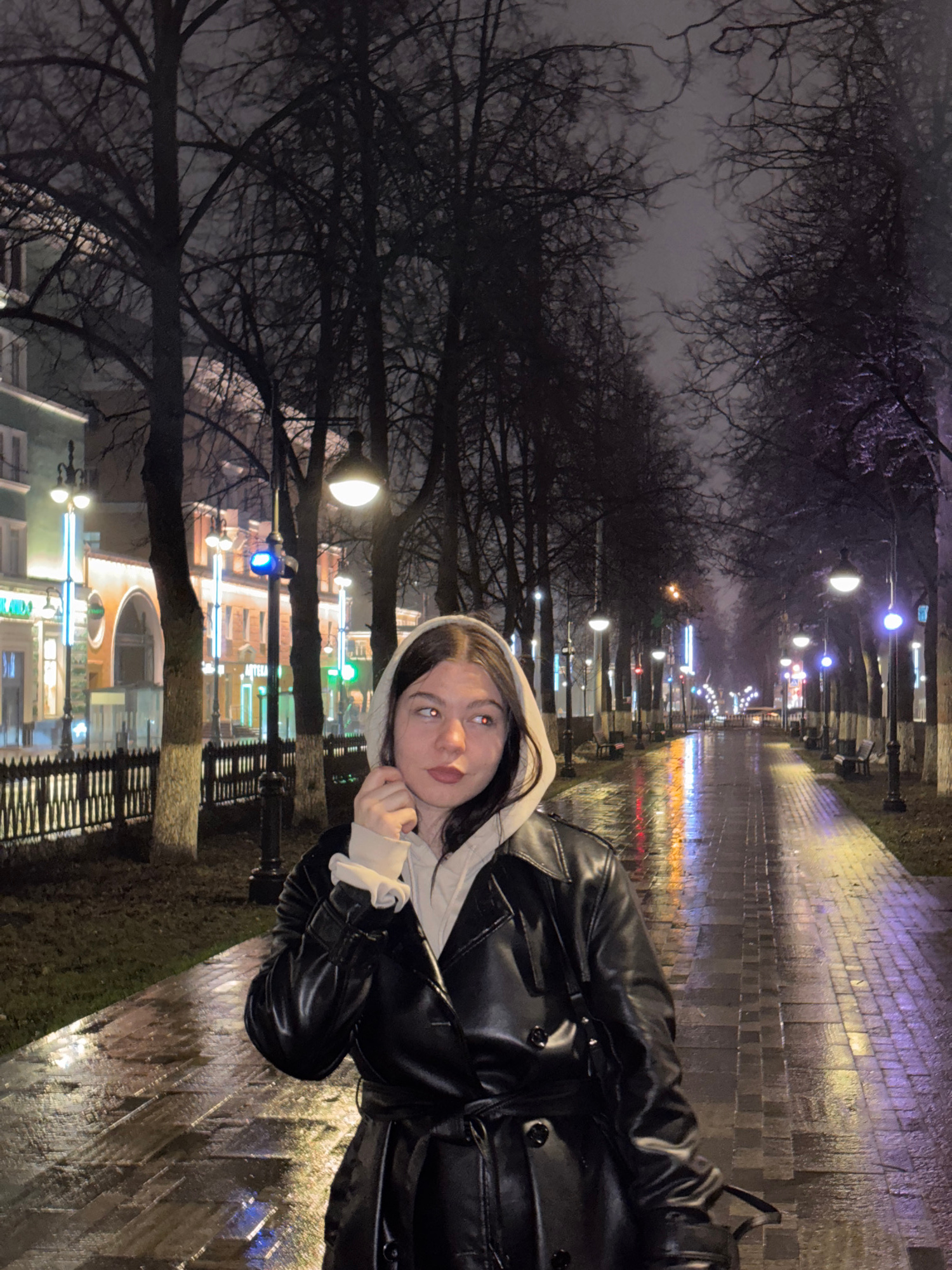 A young woman with pale skin, dark hair, and dark eyes is depicted in the image. She wears a light-colored hoodie under a black leather jacket and rests her chin on her hand, looking upward. She is st…read more