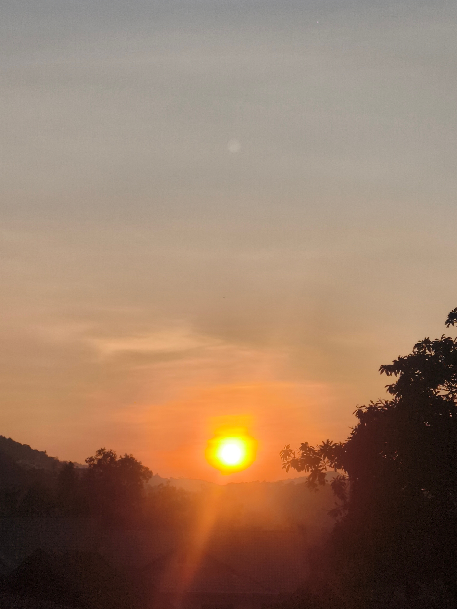 The image shows a sunrise or sunset in a landscape with trees. A bright sun dominates the center of the horizon. The sky fades from orange near the sun to a lighter gray at the top. Trees are silhouet…read more